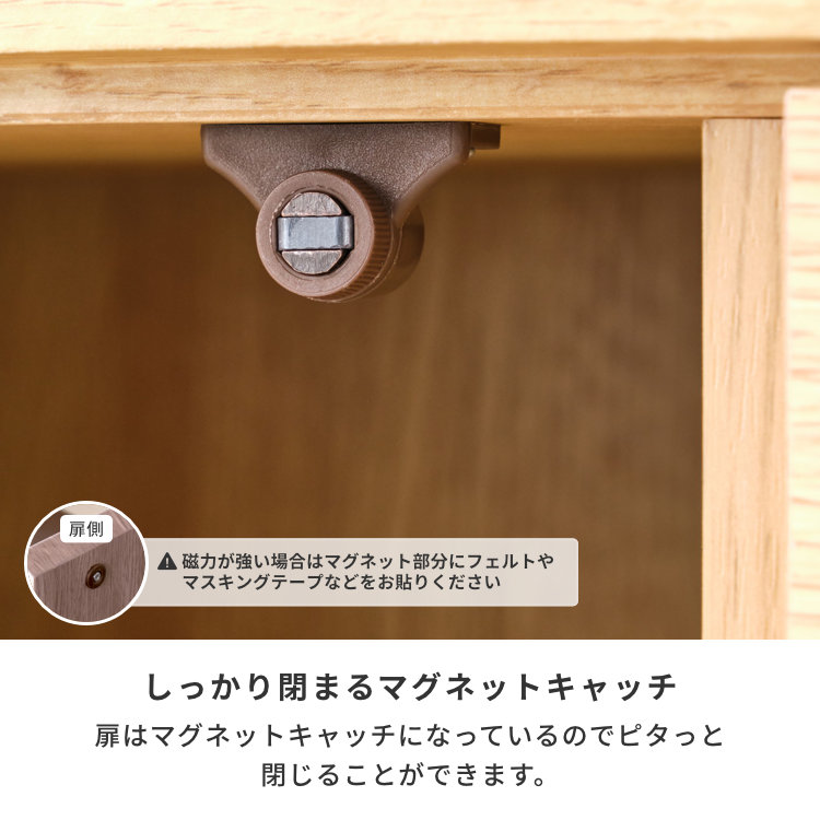 シンプルでフラットなフォルムの110cm幅キャビネットです。35cm角正方形の6つの開き扉内側は可動棚付き。CDや雑誌、A4サイズファイルなど収納物の大きさや用途に合わせてスッキリ収納。四隅の脚に加え中央にも脚を付け、がたつき防止のアジャスターもついています。リビングやキッチン、寝室、子供部屋など様々なシーンでご活用いただけます。明るく木目の美しいオーク材を使用したナチュラル色と、シックで落ち着いた風合いのウォルナット材を使用したミディアムブラウン色の2カラーからお選びいただけます。