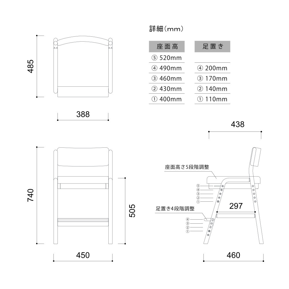 ・座面5段階・足置きは4段階で3cmずつ高さ調整可能