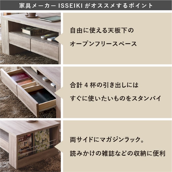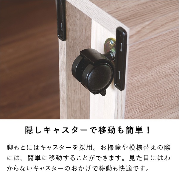 優し気なイメージで家具には珍しいグレー木目カラー。木目柄のシートを使い落ち着いた雰囲気に仕上げました。リビングに散乱するリモコンや雑誌などをしまえる引き出し、サイドに付いたマガジンラックが収納力のポイント。隠しキャスターが付いて移動も楽にできます。お掃除や模様替えなど、ちょっと動かしたい時にとても便利。大人シンプルなお部屋だけでなく、モダンテイスト、北欧テイストのインテリアにもしっくり馴染みます。
