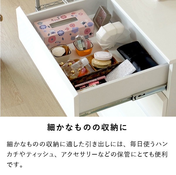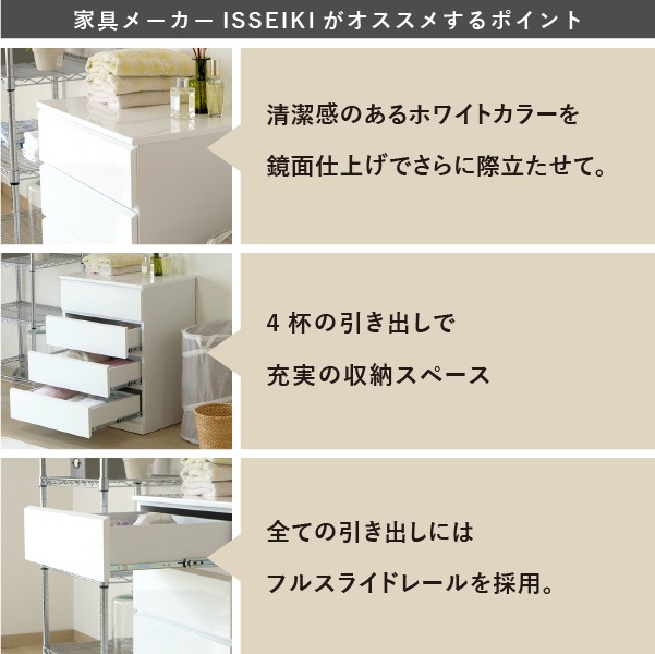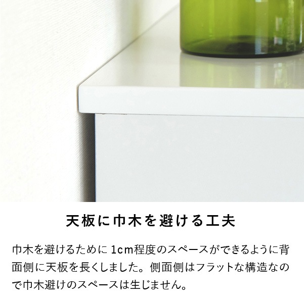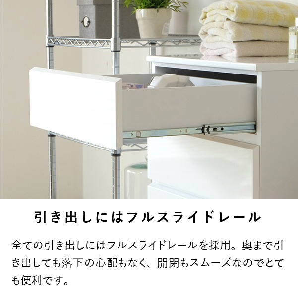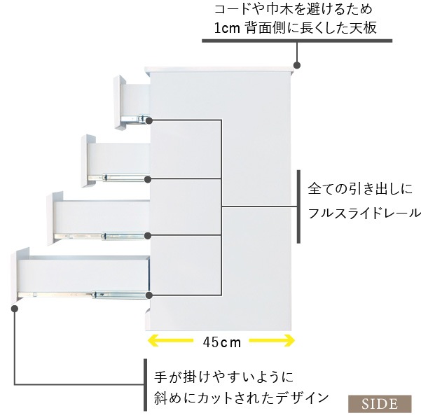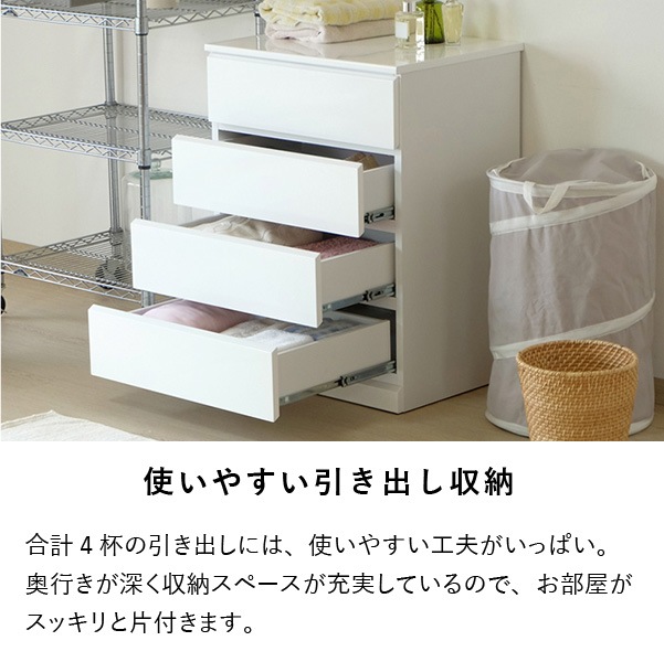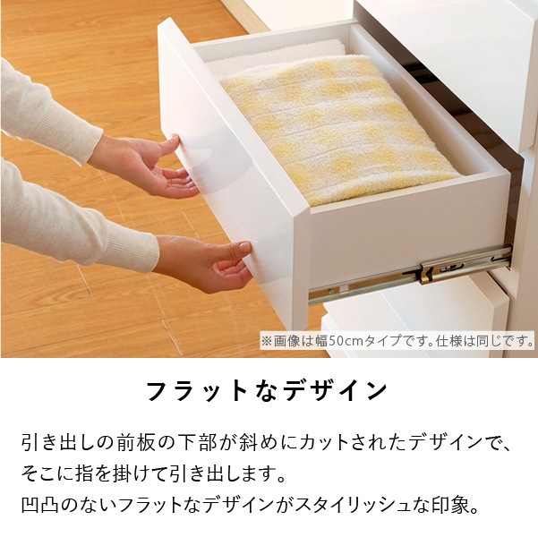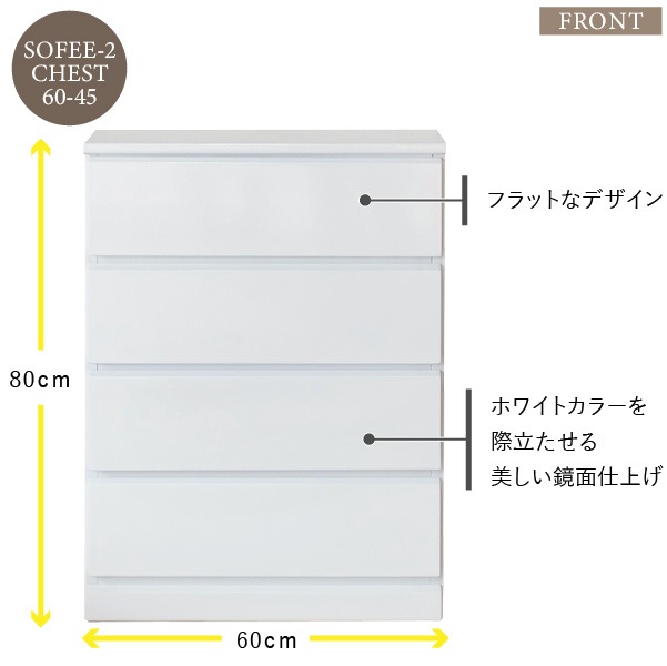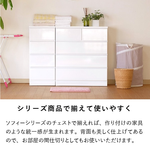 清潔感のあるホワイトカラーが美しくシンプルなデザインの『ソフィー』。どこに置いても違和感がなく脱衣洗面所やリビング、寝室など家じゅうのあらゆるところで活躍します。こちらの商品は幅60cm奥行45cmタイプになります。使いやすいサイズで家中どこに置いても重宝します。全体は美しいホワイトカラーを水や汚れに強いウレタン塗装を艶やかな『エナメル鏡面仕上げ』にし、高級感のある仕上がりに。引き出しの前板の下部が斜めにカットされたデザインで、そこに指を掛けて引き出します。全ての引き出しにはフルスライドレールを採用。奥まで引き出しても落下の心配がなく、開閉も軽やかでとても便利です。壁にぴったりと付けて配置できるように天板の背面側を長くしました。それによって、壁とのスペースがが1cm程できるので巾木を避けることができます。限られたスペースを有効に利用できるよう設計された『ソフィー』シリーズで揃えれば作り付けの家具のような統一感が生まれます。背面も美しく仕上げてあるのでお部屋のパーテーションのようにも使える使いやすいシリーズです。