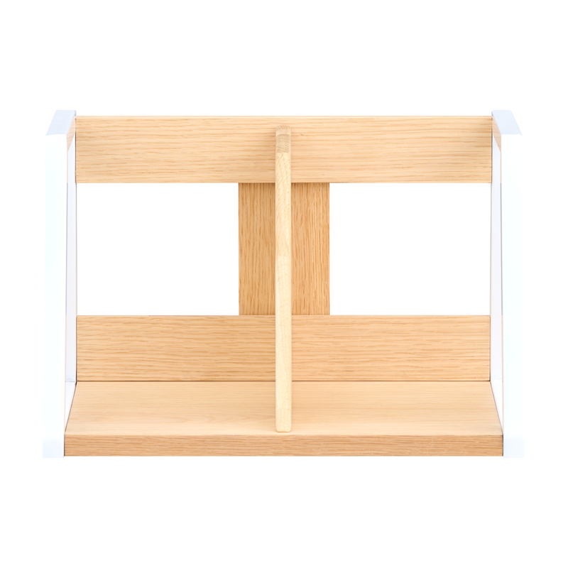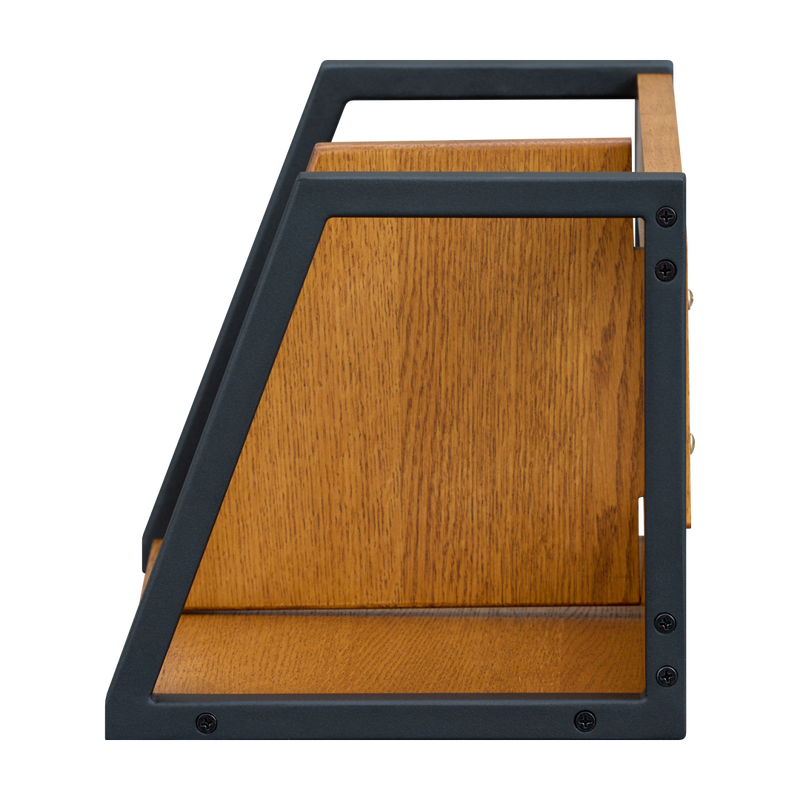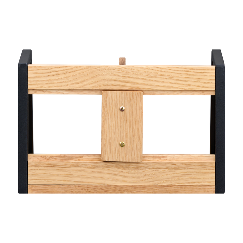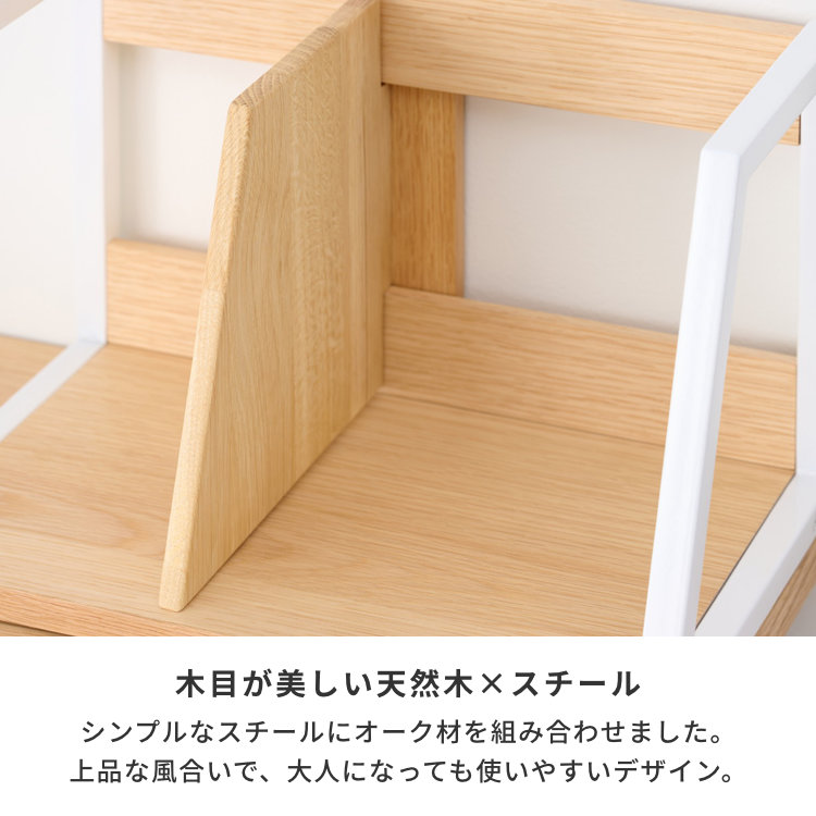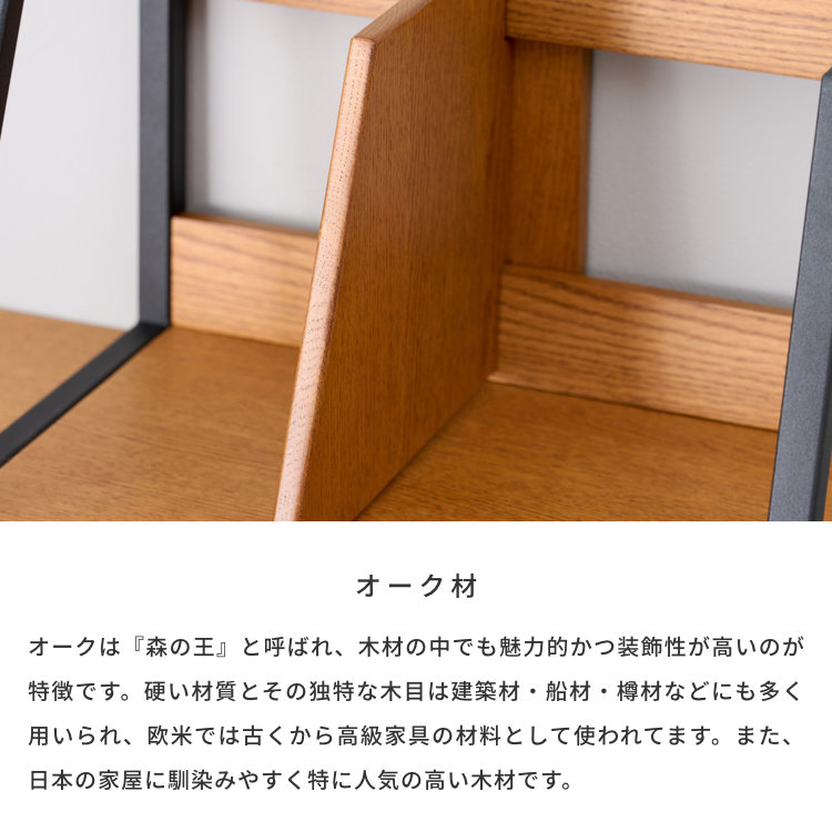 幅35cmとコンパクトで使いやすいサイズ感。オークの無垢材を使用して作られた卓上ブックスタンドです。フレームにはマットな質感のスチール材を使用しており、木とスチールの組み合わせがお洒落な人気の異素材ミックスです。落ち着きのある無垢材そのものの木色がモダンな風合いの空間を演出。インダストリアル風なお部屋作りをお楽しみいただけます。シンプルなデザインなので、学習机の上だけでなくオフィスや作業台でもお使い頂けます。