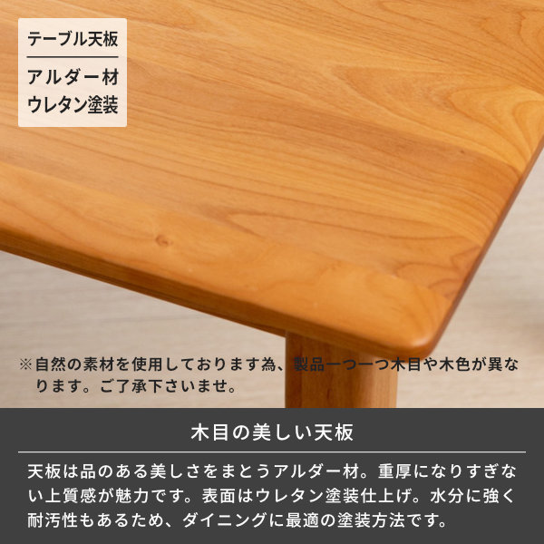 アルダー無垢材を使用し、飽きの来ないシンプルなデザインと優しい木の風合いが人気の『エリス』シリーズのダイニング3点セット。