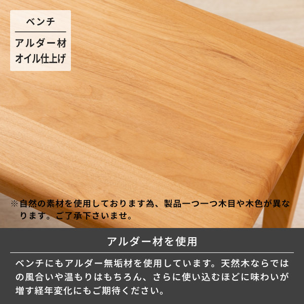 ERIS-2 125 DINING TABLE 同じシリーズで探す同じ素材で探す同じシーンの商品で探す同じテイストの商品で探す - アルダー材の美しい木目が目を引く『エリス』。角に丸みを持たせたデザインは使う人に優しさと思いやりを届けます。自然系オイルで仕上げているので、小さなお子様のいるご家庭でも安心してお使いいただけます。ダイニングテーブルは使いやすさにもこだわって天板は水分や汚れに強いウレタン塗装で仕上げました。そうすることで、お食事の際にうっかり汚してしまってもそれが痕に残りにくくなります。お手入れも簡単に済むのでいつでも清潔に保つことができるのが特徴です。脚には床との接地面にアジャスターがついていますので、使い続けるうちに発生してしますがたつきにもしっかり対応し、末永くお使いいただけるようになっております。ダイニングベンチは日本人の体系に合わせて一番座りやすい高さに座面を設定。毎日お使いいただくものなので長く座っていても疲れにくく、体に負担をかけにくいように考えました。幅100cmというサイズも使い勝手が良く、とても人気の商品です。楽しい食卓がますます楽しくなる使いやすいダイニング3点セットです。