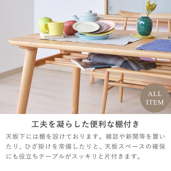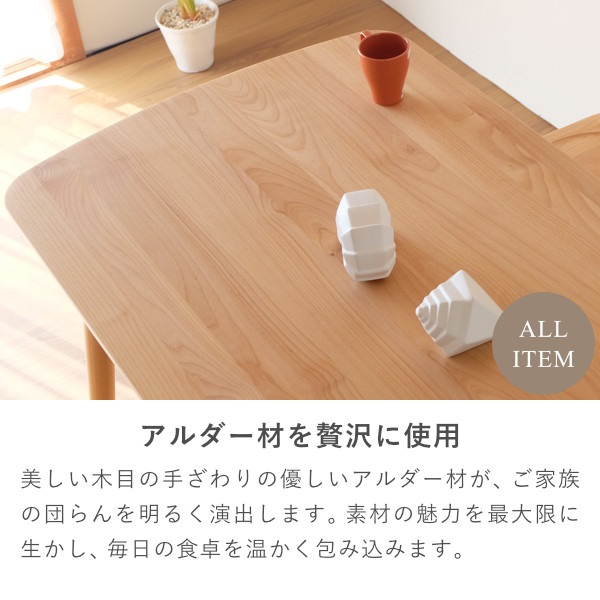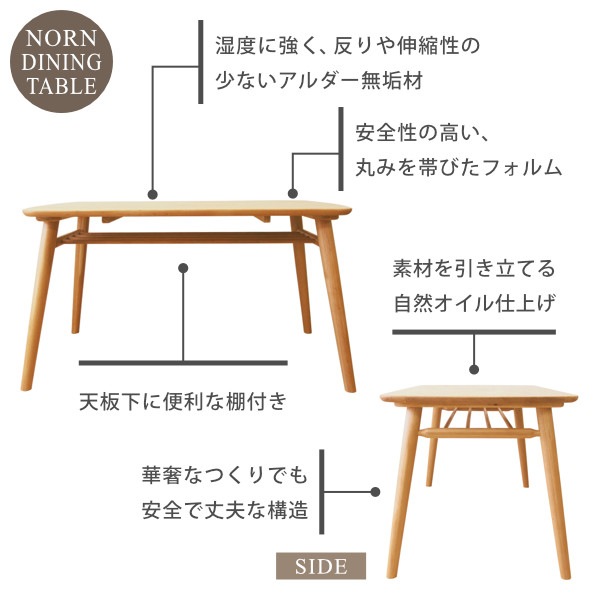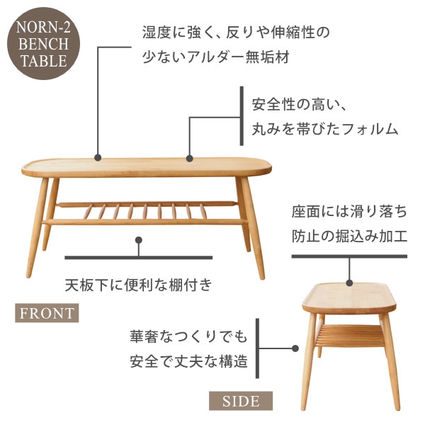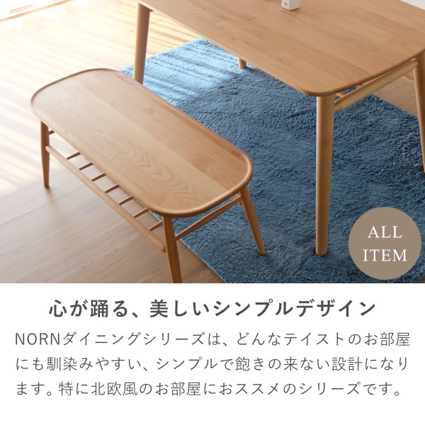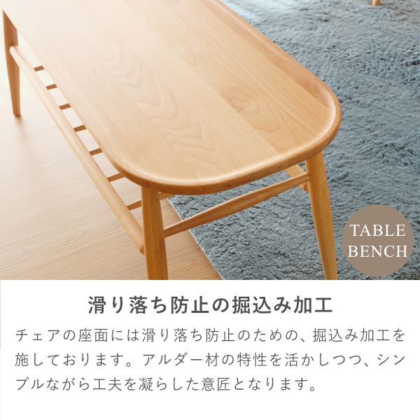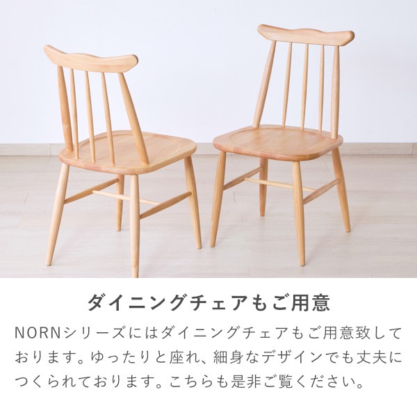 北欧デザインをベースとしたウインザー調のフォルムが美しい『ノルン』シリーズのダイニング3点セット。リビングテーブルとしても使えるベンチには滑り落ち防止のための掘り込み加工を施し、座りやすく設計しているので体にフィットして座りやすくなっております。ダイニングテーブルには収納棚がついているので、テーブルを広々と使うことができます。美しいアルダー無垢材を自然系オイルで仕上げた優しい雰囲気の食卓セット。家族の笑顔が集まる場所としての役割を十分に果たす美しいダイニング3点セットです。