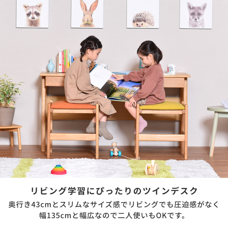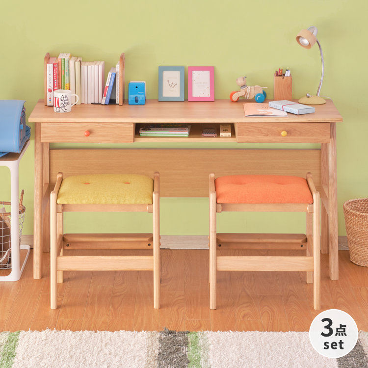 LEPTON(レプトン)シリーズのデスクとスツール(イエロー2脚)の3点セットです。 デスクは幅135cm、2人で仲良く座れるワイドなサイズのツインデスクです。左右にある2杯の引き出しはフルスライドレールで奥までしっかり引き出せ、引き出しのつまみは、ナチュラル、イエロー、オレンジの3色で変えられるようにデスクに付属しています。 四角い座面に腰がきちんと収まり、体形やデスクの高さに合わせて座面を42cm~51cmまで4段階で調節できます。また足置きも調節できますので、ぶらぶらと脚が遊ぶことがなく正しい姿勢で着座できます。