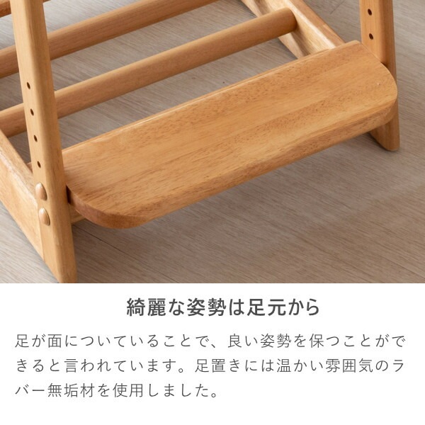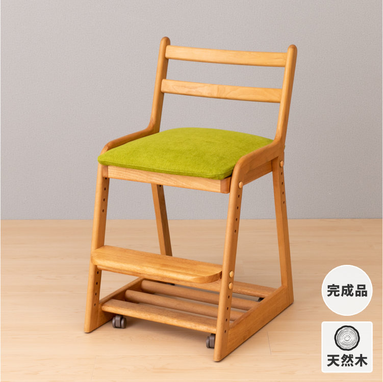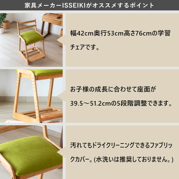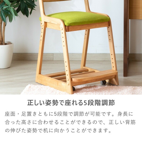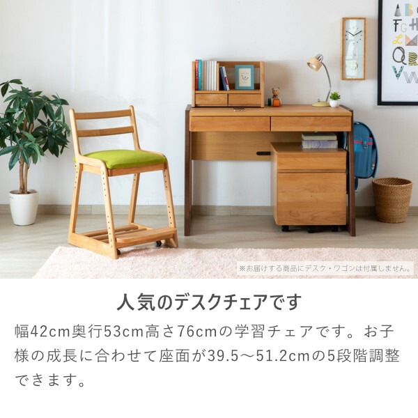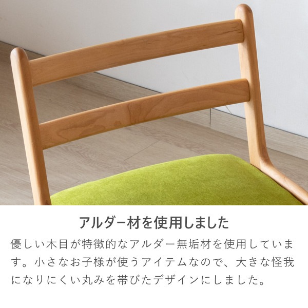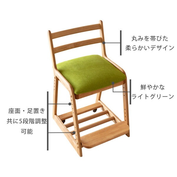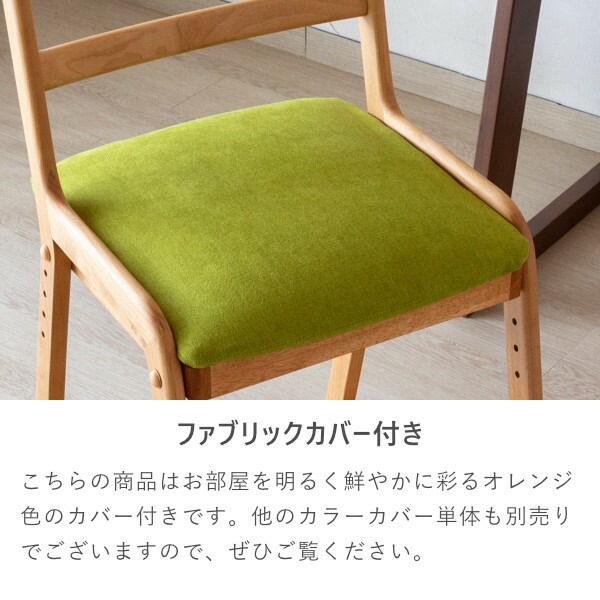 チェアと専用カバー (ミス-ライトグリーン) のセットです。優しい雰囲気のアルダー材で作った、LIFE DESK CHAIRは、フレームには無垢材を使っておりますので、温かみのある木の風合いを、存分に味わうことができます。座面はホワイトのPVC。汚れに強く、お手入れしやすい素材です。カバーはドライクリーニングが可能。また、座面と足置きは高さを変えることができますので、お子様の成長に合わせて調節できます。