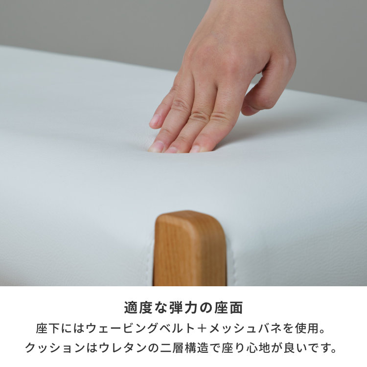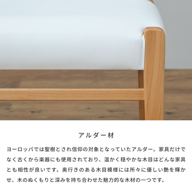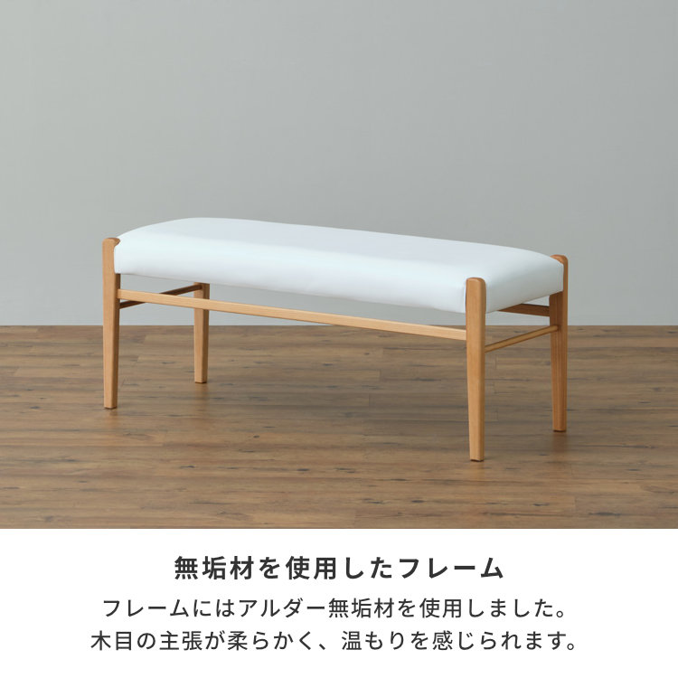 - アルダー無垢材をたっぷり使った、ナチュラルテイスト溢れるダイニングベンチです。木の風合いを感じることができるオイル仕上げですので、世界に二つとない美しい木目と、自然が織りなす自然な木色をお楽しみいただけます。幅は105cm、同シリーズのダイニングテーブルにちょうど良く収まります。座面はホワイトのPVC。3色のカバーリングがついていますので、洗い替えでき清潔にお使い頂けます。気分やお部屋の雰囲気に合わせて付け替えることができます。