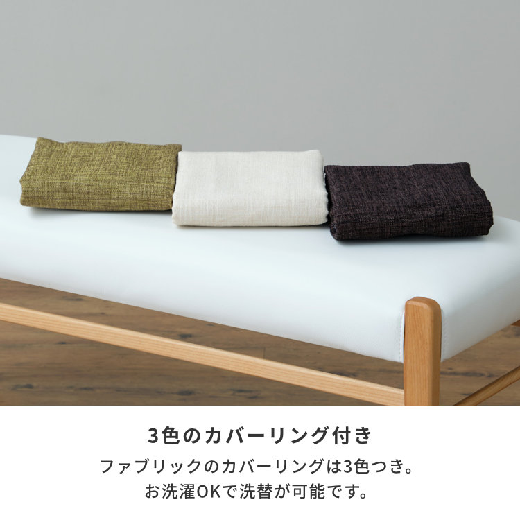 木目が緻密で美しいアルダー無垢材を使った北欧テイストのダイニングベンチです。グリーン、ブラウン、ベージュの3色のカバーリングが付いていますので、お部屋の雰囲気や気分に合わせて付け替え頂けます。本体の座面はPVC素材。清潔感のあるホワイトカラーでお手入れがしやすい素材です。同じシリーズのダイニングテーブルと合わせてお使い頂ければ統一感のあるダイニングを演出できます。