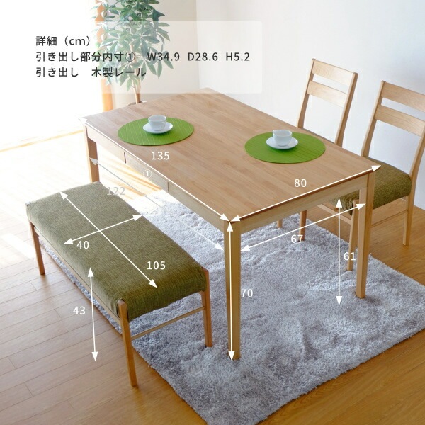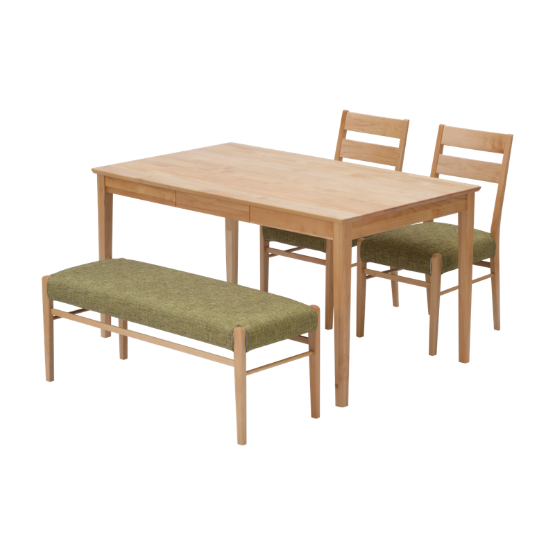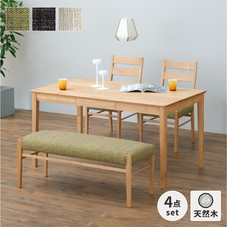 木目が緻密で美しい無垢材を贅沢に使った北欧テイストのダイニングテーブル+ベンチ+チェア2脚の4点セットです。使いやすいサイズの幅135cmは4人掛けにちょうど良いサイズです。天板下には前後に引き出し付を設置、テーブルの上に置きがちなリモコンやカトラリー、小さなテーブルウェア等をさっと収納できます。 ダイニングチェアとベンチは座面の張地にPVC生地を採用し汚れなどに強くなっております。また、カバーリング生地もあらかじめ同梱させていただいており、お部屋の雰囲気や気分に合わせて付け替えできる様、グリーン、ブラウン、ベージュの3色をすべて付属させていただいております。