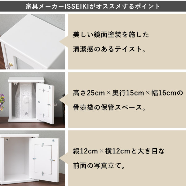 お部屋に合わせやすいシンプルなデザインのペット用仏壇です。美しい鏡面塗装を施したモダテイストのお仏壇になります。骨壺袋や思い出の品を納められる簡単開閉の収納に、大好きだったペットとの思い出を共にずっと保管できます。当製品で想定した骨壺サイズは、高さ25cm×奥行14cm×幅16cmと通常の骨壺袋でしたら余裕で納まります。前面の写真立ては縦12cm×横12cmと大きく、思い出の一枚をずっと傍で感じられます。また、細部にもこだわって作られており、取っ手を可愛らしくあしらい、背面は綺麗な化粧仕上げとなってます。