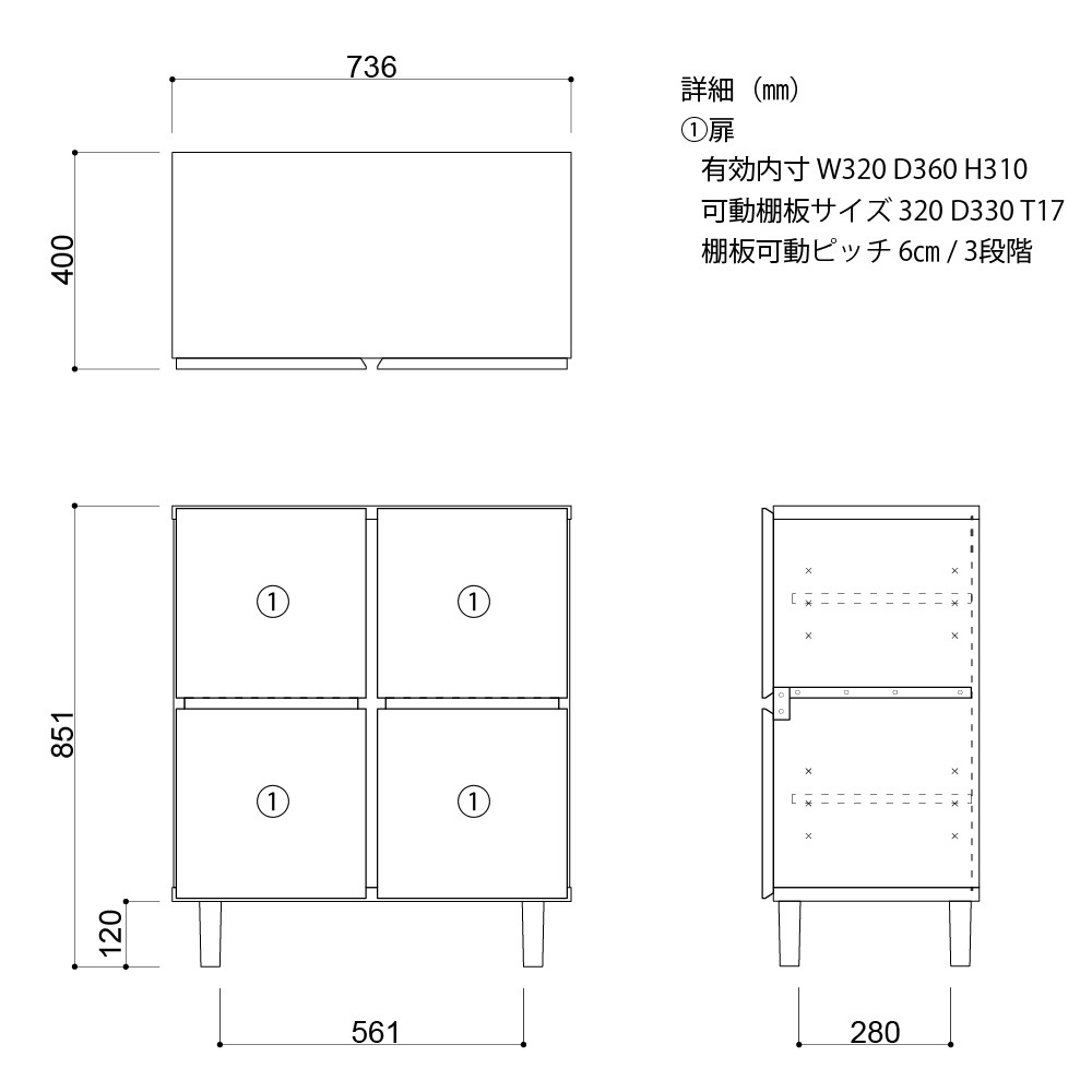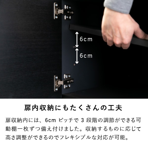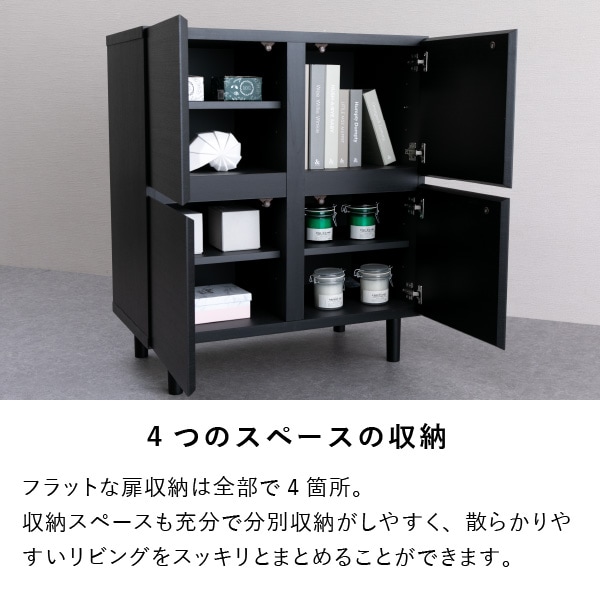 お部屋をすっきりと見せる、お洒落でシンプルな収納家具です。4か所に分かれた収納部分には、全て3段階で調節できる可動棚がついてます。可動棚を外すことで、A4サイズの書類の収納も可能です。適度なサイズで4つに分かれている収納スペースは、収納物の種類や項目ごとに分けたり、家族で各々の専用の収納スペースを決めたりとアイデア次第で便利に活用できます。