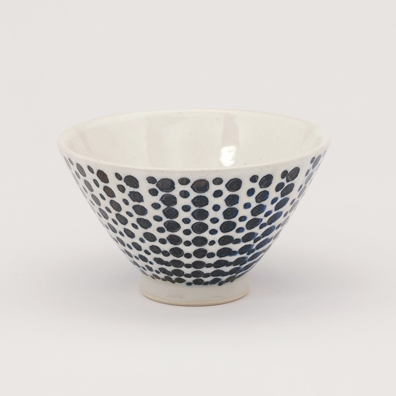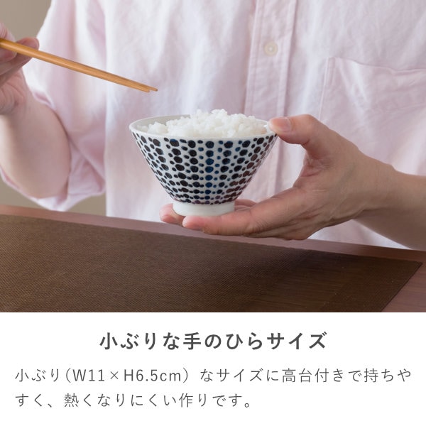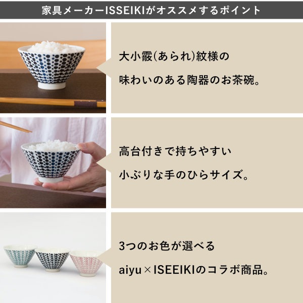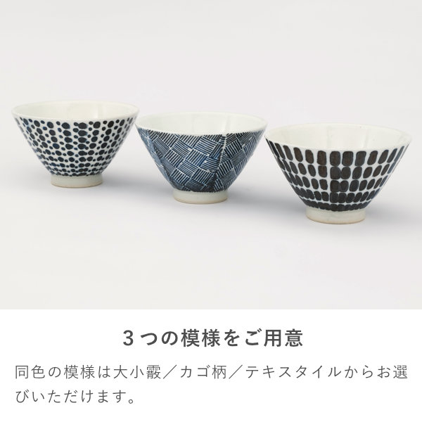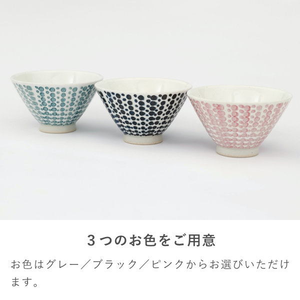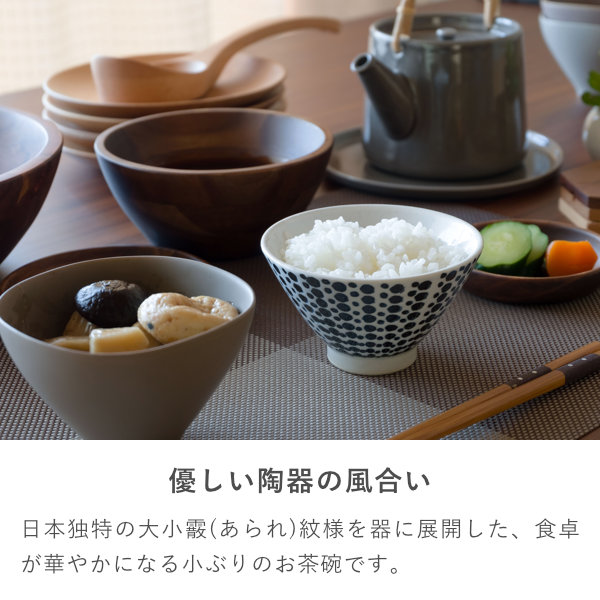 大小霰の紋様を器に展開した、小さめの素敵なお茶碗です。陶器の優しいあたたかみ、一つ一つが手作りなので味わい深い仕上がりとなっております。高台が付いてるので持ちやすく、熱くなりにくい持ちやすい作りです。お好みで選べる3つのシリーズに各3色ををご用意しております。レンジ・食洗器にも対応可能です。