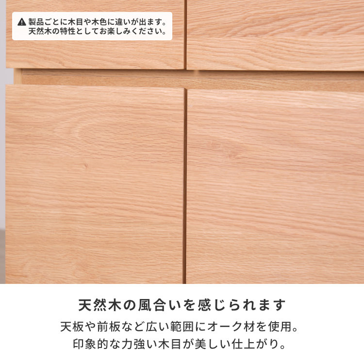 年齢性別問わずに使いやすい、シンプルなスクエアの本体にほっそりとした脚部を組み合わせた幅120cmサイドボード。天板や前板といった広い範囲にオーク材の突板を使用。力強い木目が魅力的な、天然木ならではの風合いを感じられます。よく使う小物類を収納しやすい引出しと、しまうものに合わせて高さ調節のできる棚付きの扉収納。棚板を外せばA4サイズのファイルを立てて置くことができます。脚部の高さは17cm。お掃除がしやすいのはもちろん、カゴなどを置いて本体下収納スペースとしてもご活用いただけます。