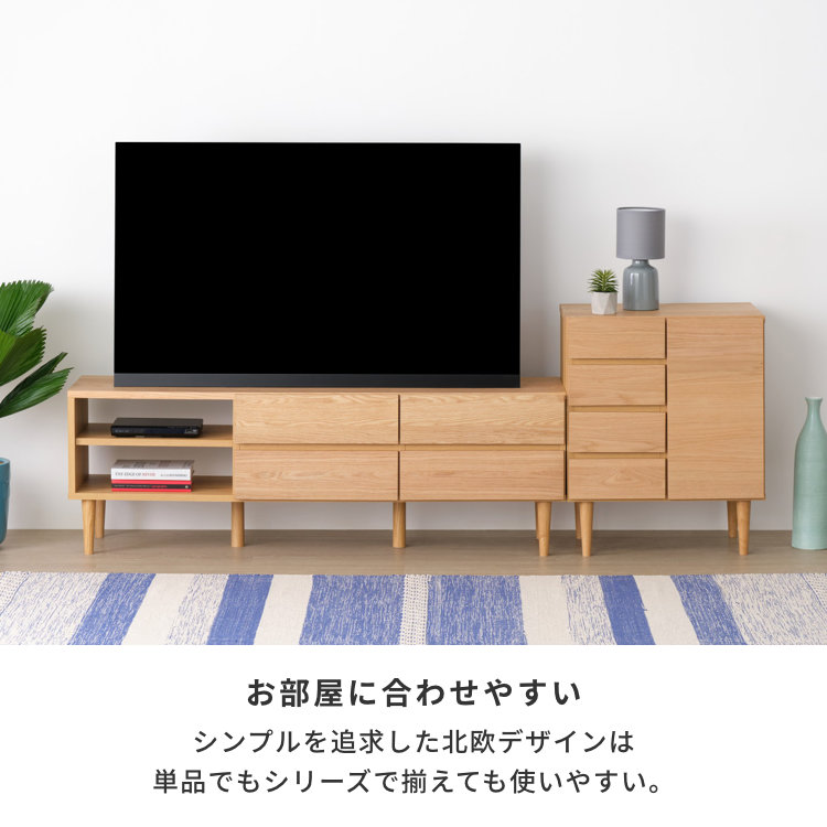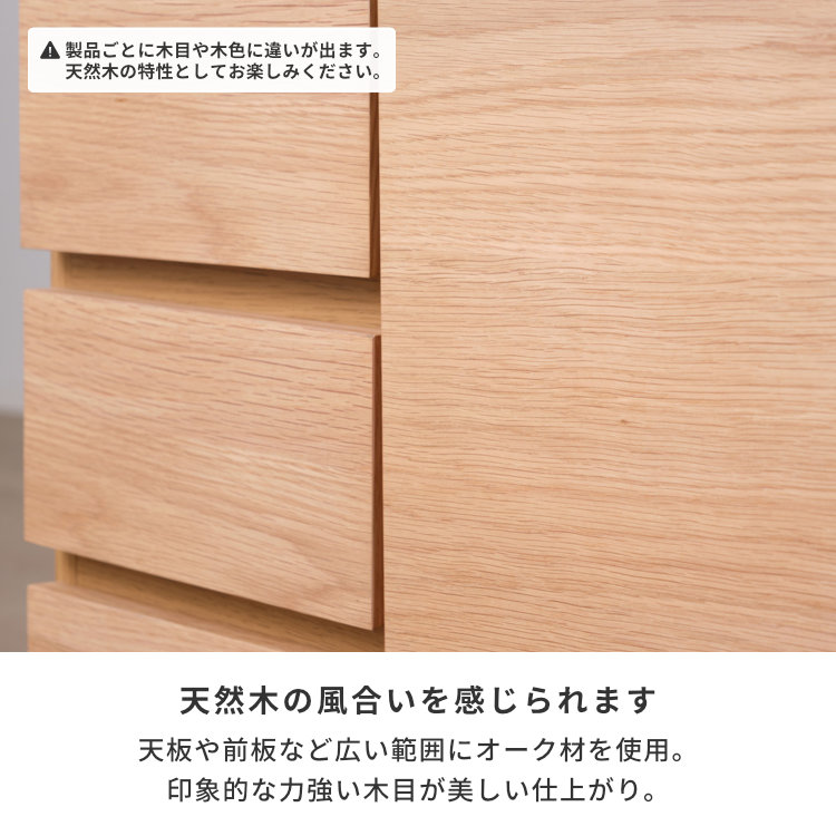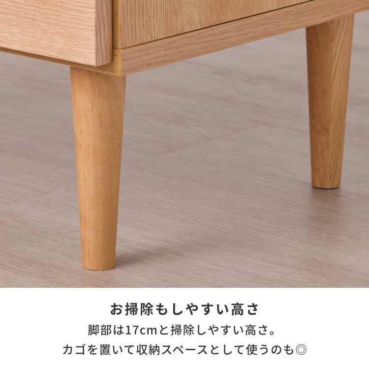 年齢性別問わずに使いやすい、シンプルなスクエアの本体にほっそりとした脚部を組み合わせた幅60cmリビングボード。天板や前板といった広い範囲にオーク材の突板を使用。力強い木目が魅力的な、天然木ならではの風合いを感じられます。よく使う小物類を収納しやすい引出しと、しまうものに合わせて高さ調節のできる棚付きの扉収納。棚板は取り外してのご使用も可能です。脚部の高さは17cm。お掃除がしやすいのはもちろん、カゴなどを置いて本体下収納スペースとしてもご活用いただけます。