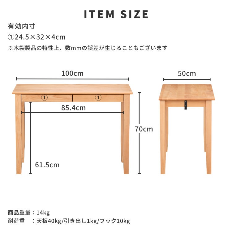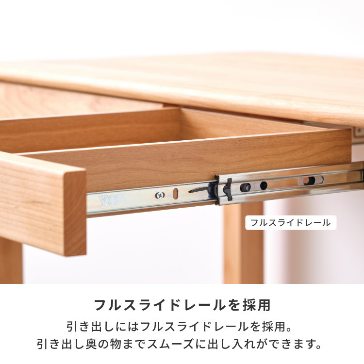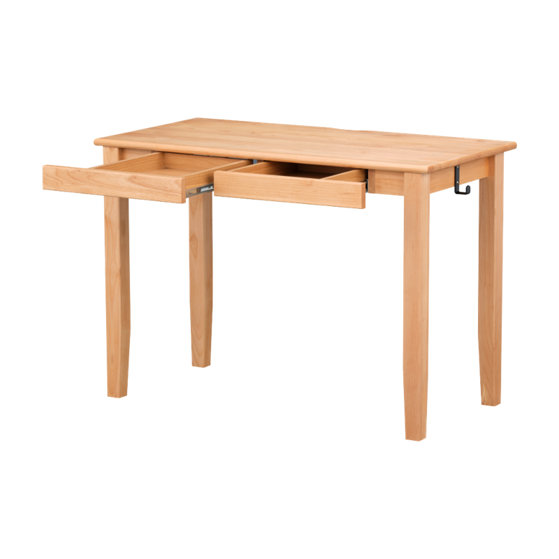 アルダー無垢材を贅沢に使用したAIRYシリーズの学習デスクです。リビングでも使いやすい幅100cm×奥行50cmコンパクトサイズです。ノートや文房具の整理整頓に便利な引き出しが左右に2杯あり、A4サイズの物を収納することが可能です。引き出しにはフルスライドレールを採用しており、引き出し奥の物までスムーズに出し入れができます。デスク両側に金属製の丈夫なフック付きで、カバンや帽子をかけられお部屋をすっきりと保てます。