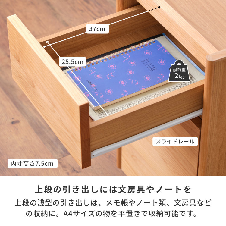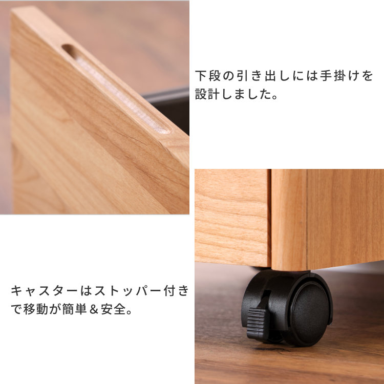 AIRYシリーズのデスクワゴンです。前板にアルダー無垢材を使用し、上下に2杯の引き出しがあります。A4サイズの物を平置きで収納可能な浅型の上段は、メモ帳やノート類、文房具などの収納に。A4ファイルを背表紙を見せて収納可能な深型の下段には、取り外し可能な仕切り板が1枚付属、奥まで引き出せるフルスライドレールを使用しています。2杯の引き出しに加えて天板上が物置きとして使え、よく使う文具やプリントを置いておくのに便利です。
