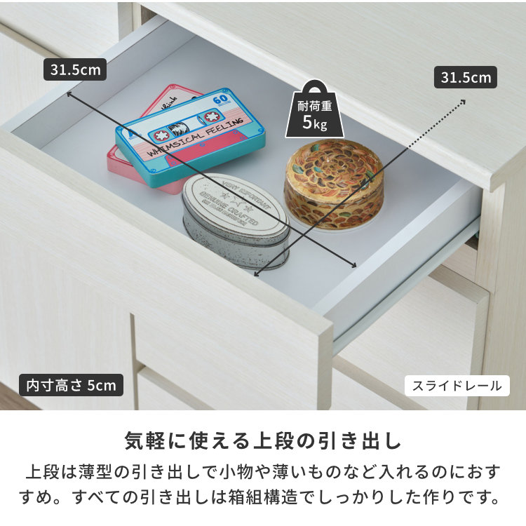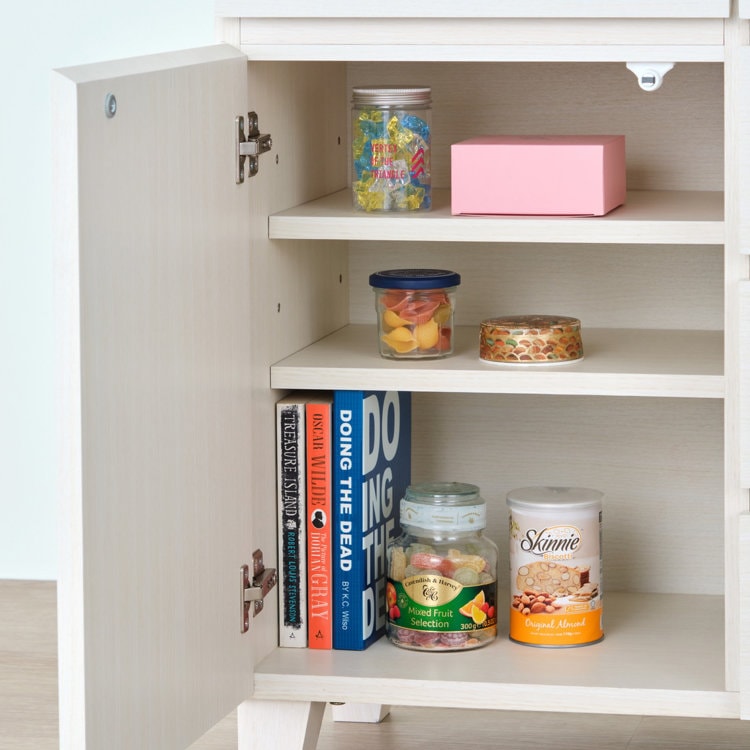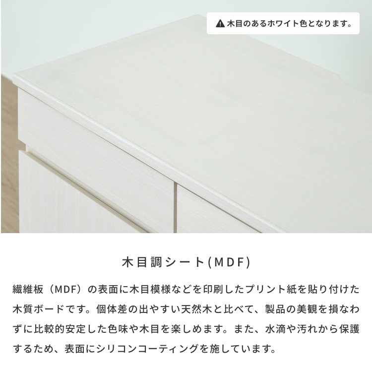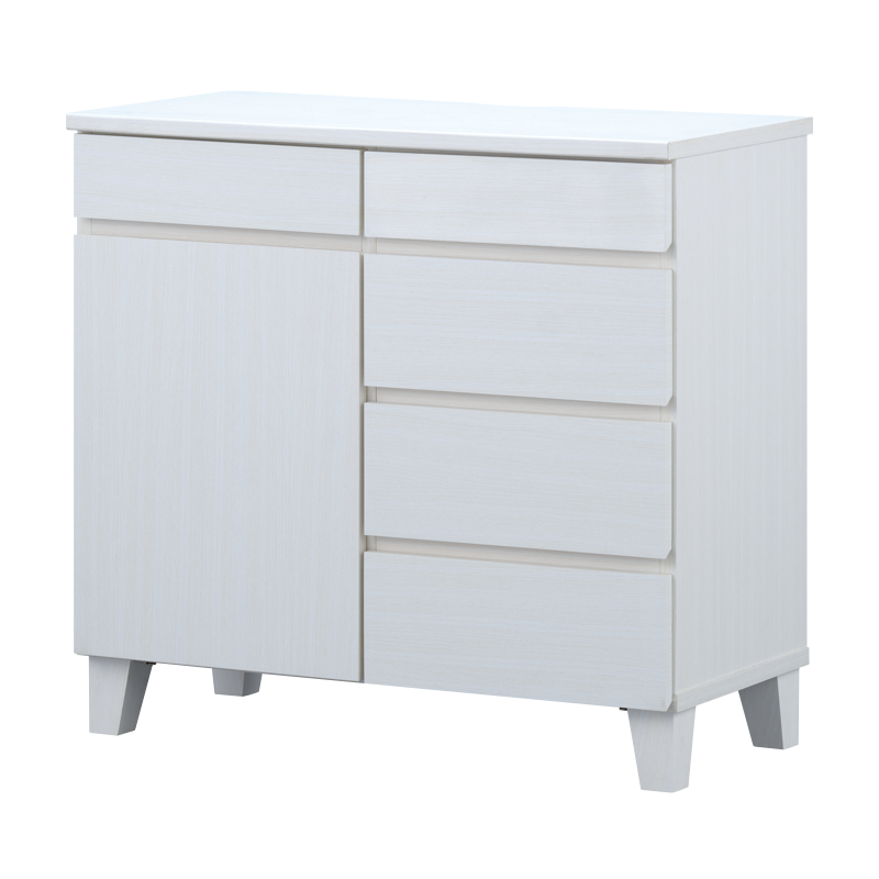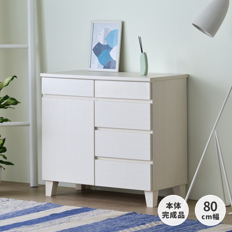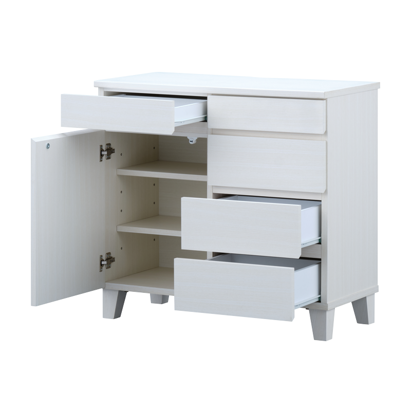 幅80×奥行40cmのサイドボード。シートを使い様々なカラー展開があるのが特徴。引き出しは5杯、開き戸部分の収納スペースは可動棚が2枚と充実の収納力。幅80cmとコンパクトながら、充実の収納スペースが人気の商品。ナチュラルでシンプルな北欧調デザインは、リビングの収納やチェストとしても大活躍する事間違いなしです。