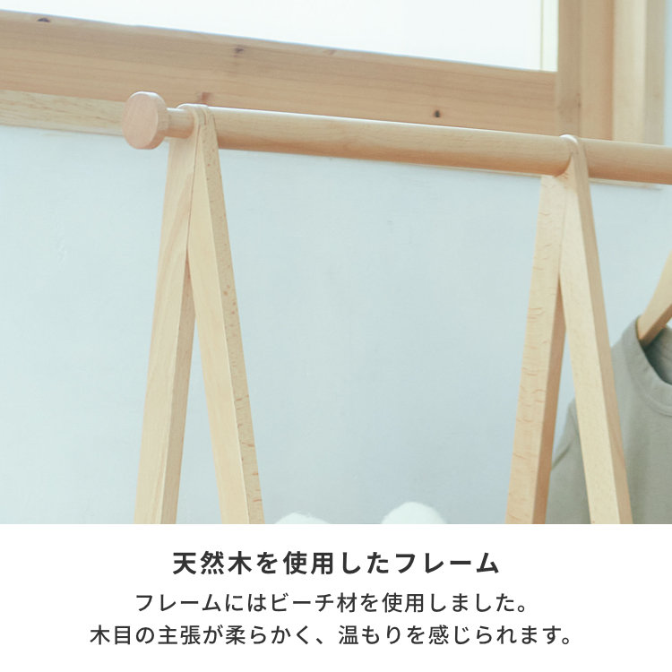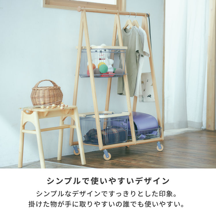 コンパクトなサイズのバスケット付きハンガーラック。取手付きの収納カゴは持ち運びも可能です。子供も手が届きやすいサイズなので、親子で一緒に使えます。