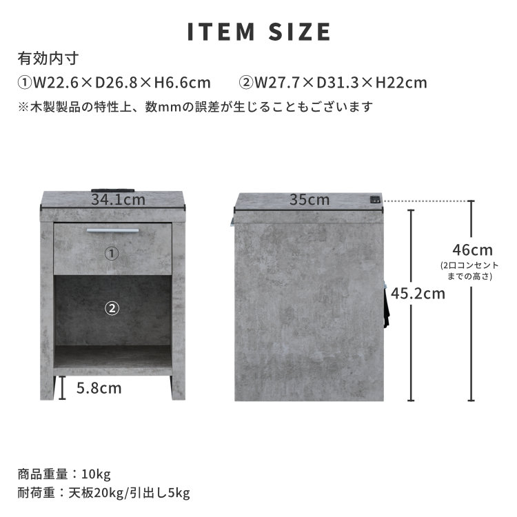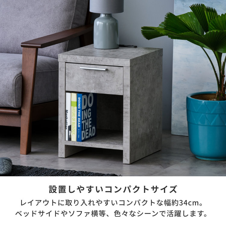 幅34 ナイトテーブル サイドテーブル コンセント付 おしゃれ コンセント ベッドサイドテーブル 引き出し シンプル モダン 寝室収納 コンセント 読書 スリム コンパクト グレー コンクリート柄 品質保証 ISSEIKI ROIS