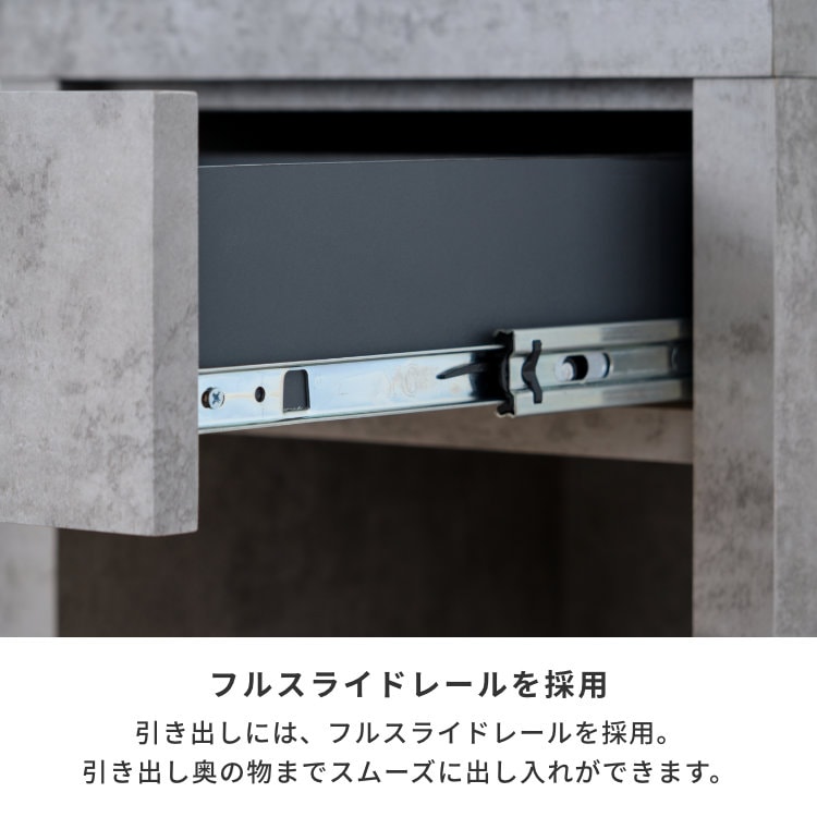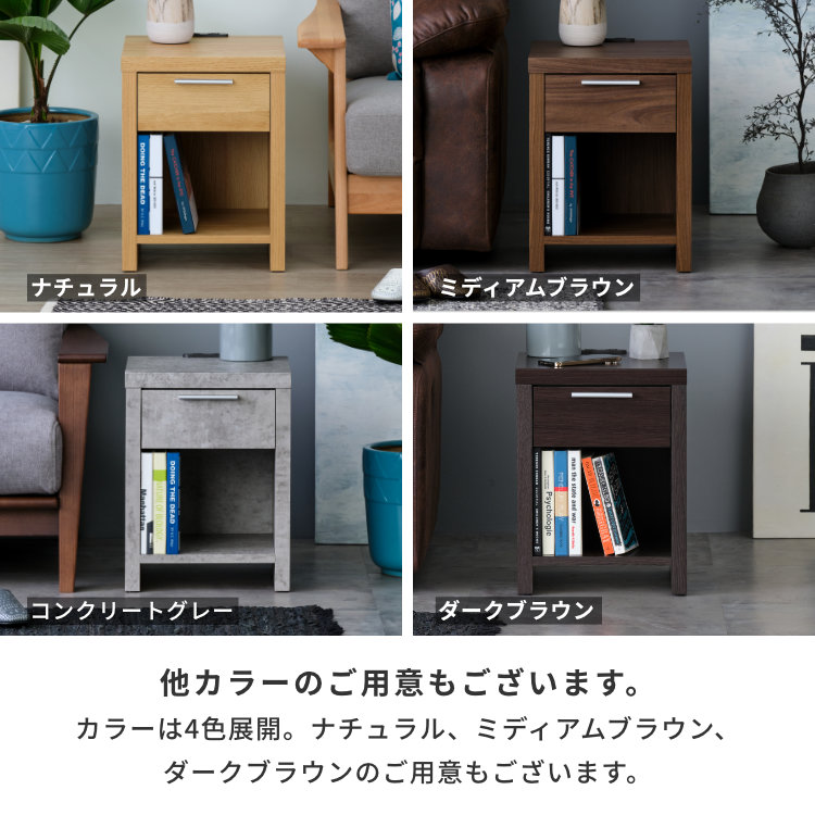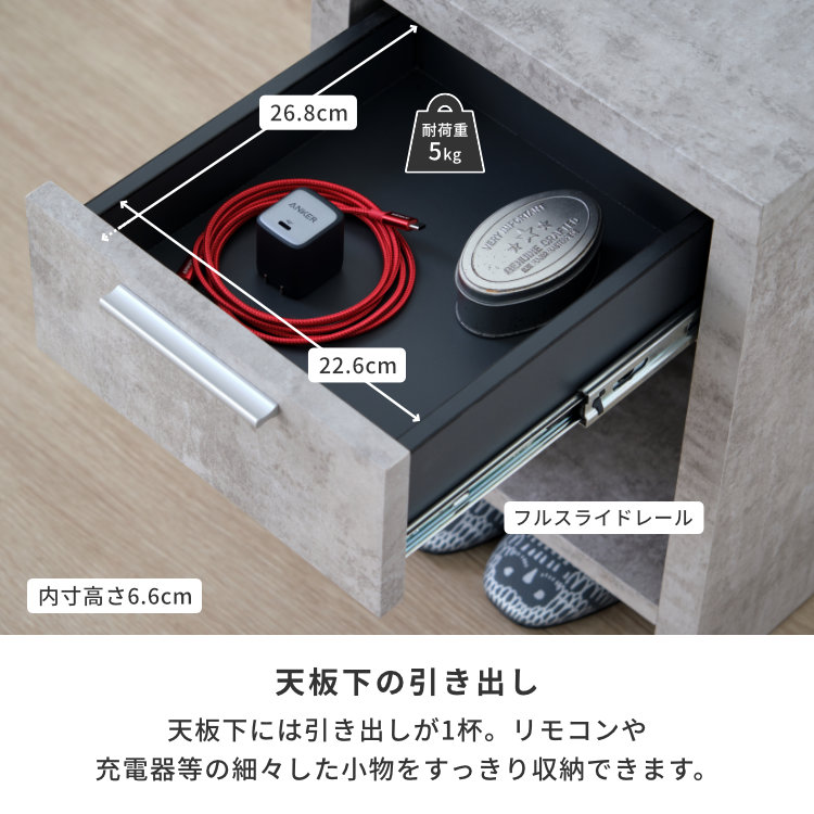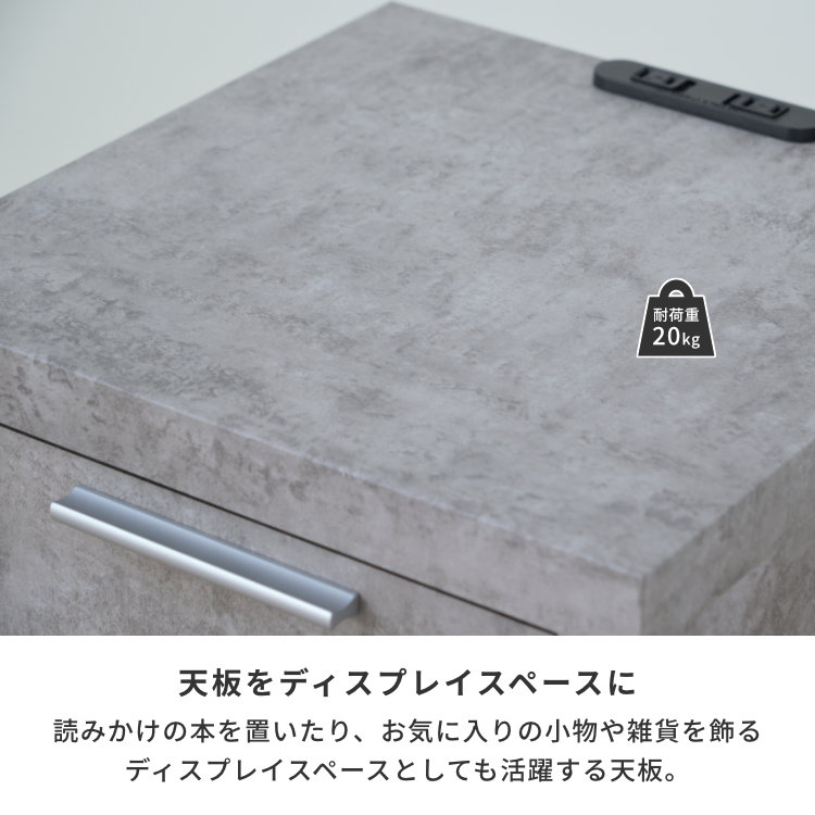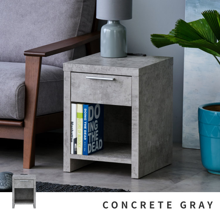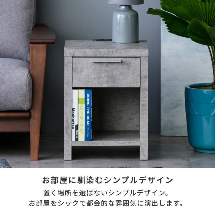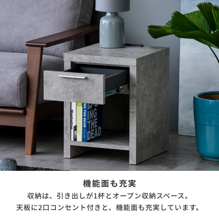 どんなお部屋にも馴染むシンプルデザインのROISシリーズのナイトテーブル。コンパクトなサイズなので圧迫感がなく寝室やリビングなど置き場所を選びません。コンクリートグレーカラーが落ち着いた印象でお部屋をシックで都会的な雰囲気に。コンクリート柄シートを使用したことで、色ムラが少なく安定した色合いでご提供が可能となりました。本や時計、スマホなどを置いておくのに便利な天板には埃の侵入を防ぐスライド式の2口(ふたくち)コンセントを設置しました。照明の電源として使用したり、スマホやタブレットの充電をしたりと便利に使えます。眼鏡やリモコンなどの収納に便利な引き出しにはフルスライドレールを採用。奥まで引き出しても落下の心配がなく安心してお使いいただけます。引き出し下のオープンスペースには、読みかけの本や雑誌などを収納したり小さなごみ箱を入れて置いたりと自分好みに自由に使えます。コンパクトながら充実の機能性で、ベッドサイドに置いてナイトテーブルとして使用したりソファの横に置いてサイドテーブルとして使用したり、様々なシーンで活躍します。