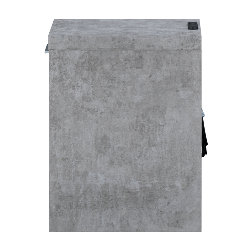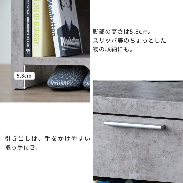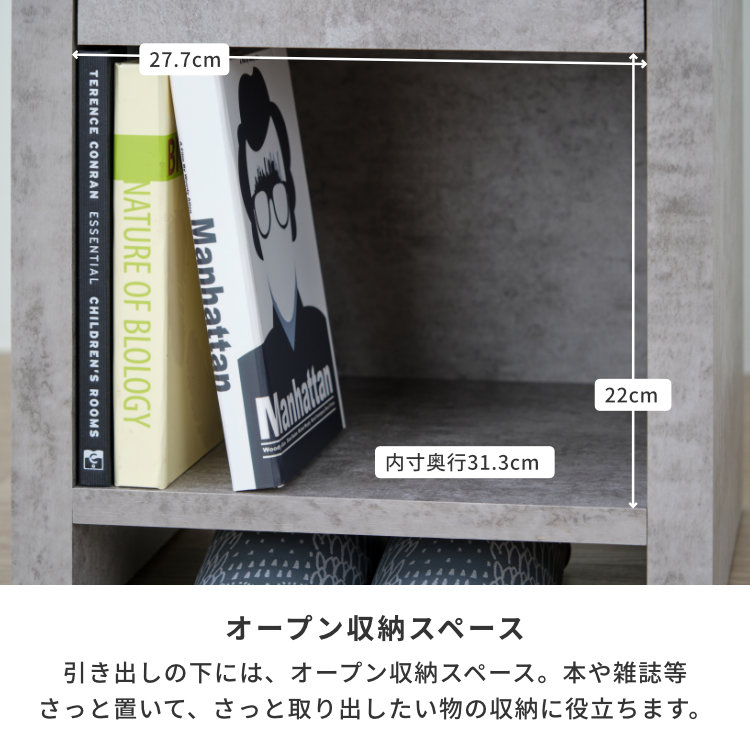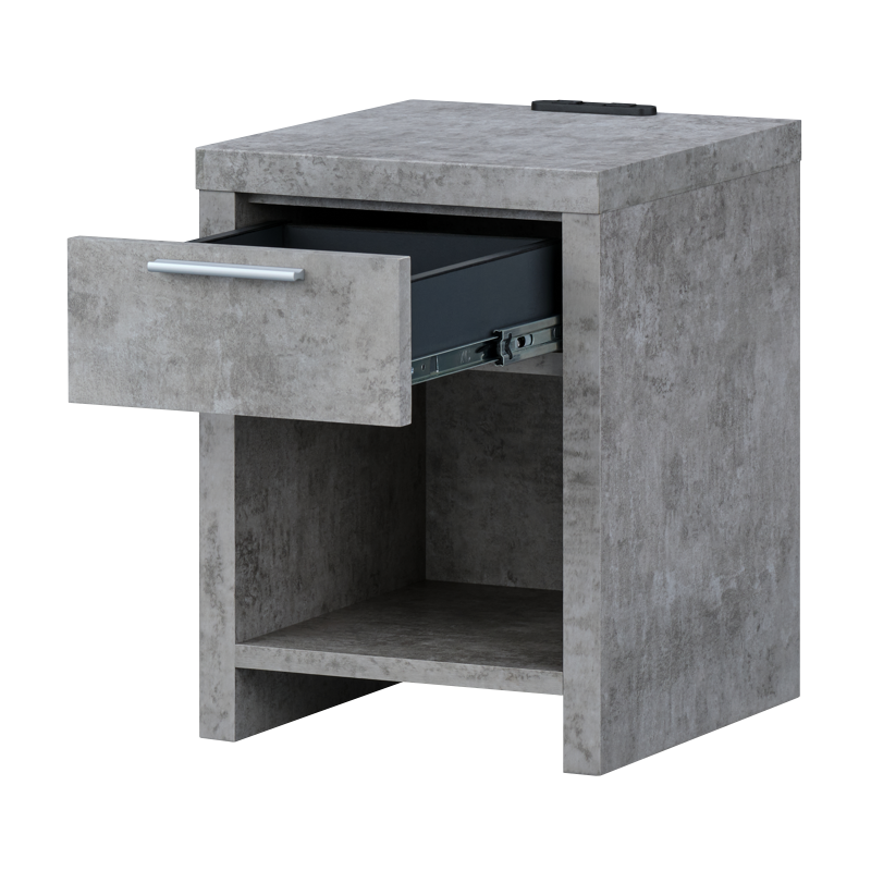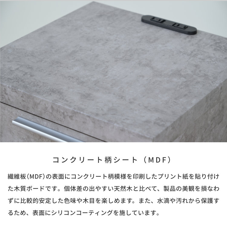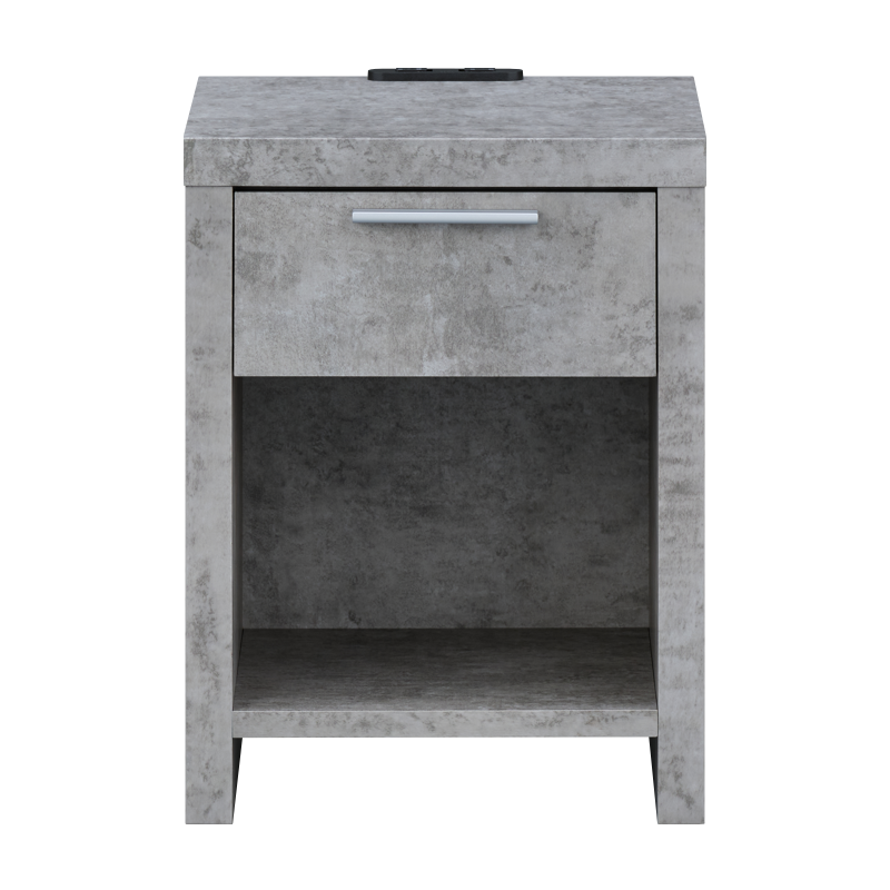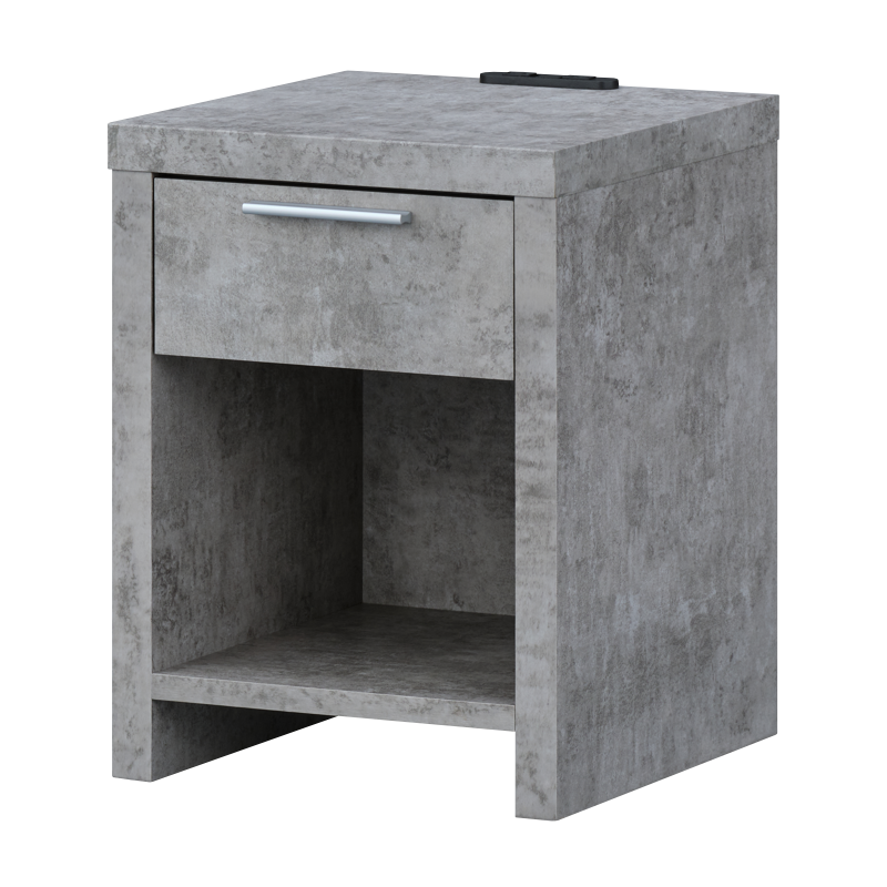 どんなお部屋にも馴染むシンプルデザインのROISシリーズのナイトテーブル。コンパクトなサイズなので圧迫感がなく寝室やリビングなど置き場所を選びません。コンクリートグレーカラーが落ち着いた印象でお部屋をシックで都会的な雰囲気に。コンクリート柄シートを使用したことで、色ムラが少なく安定した色合いでご提供が可能となりました。本や時計、スマホなどを置いておくのに便利な天板には埃の侵入を防ぐスライド式の2口(ふたくち)コンセントを設置しました。照明の電源として使用したり、スマホやタブレットの充電をしたりと便利に使えます。眼鏡やリモコンなどの収納に便利な引き出しにはフルスライドレールを採用。奥まで引き出しても落下の心配がなく安心してお使いいただけます。引き出し下のオープンスペースには、読みかけの本や雑誌などを収納したり小さなごみ箱を入れて置いたりと自分好みに自由に使えます。コンパクトながら充実の機能性で、ベッドサイドに置いてナイトテーブルとして使用したりソファの横に置いてサイドテーブルとして使用したり、様々なシーンで活躍します。