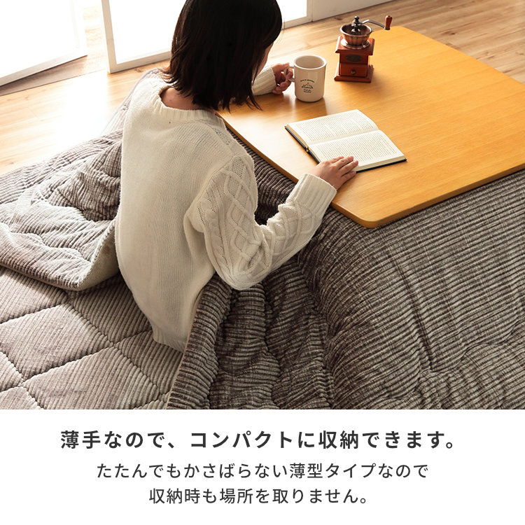 コーデュロイ調のおしゃれなこたつ布団。中綿には抗菌防臭機能付きの綿を使用。表地はコーデュロイ調の凹凸ストライプ。裏地には肌触りなめらかなフランネル生地を使用。薄手なので、コンパクトに収納できます。