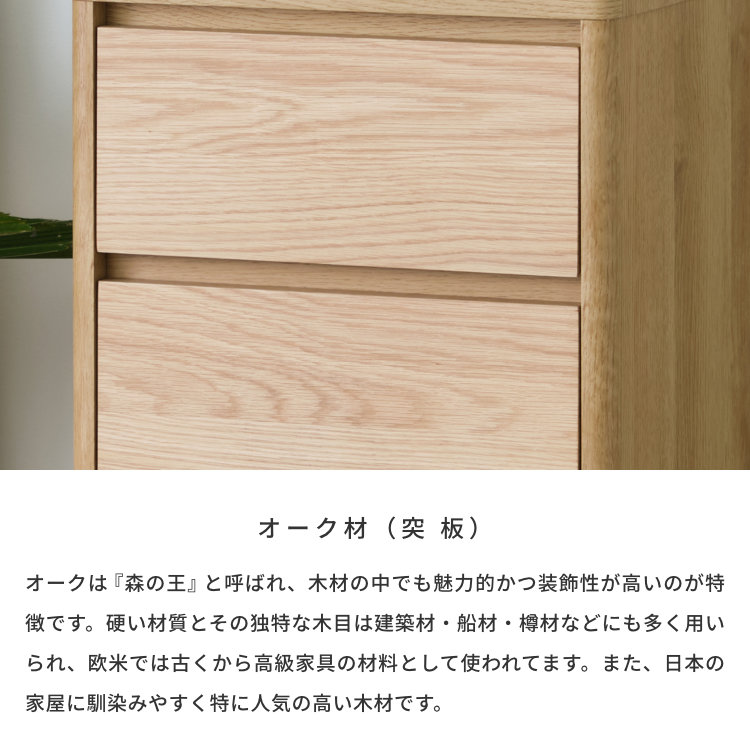 リビングや寝室など様々なお部屋で使いやすい、高さ72cmのロータイプチェストです。幅40cmのスリムタイプは細々したものや小さなタオル、靴下などの収納にピッタリ。お部屋がスッキリと片付きます。落ち着いた天然木の風合いは、長く使いたくなる飽きのこないデザインに仕上がりました。