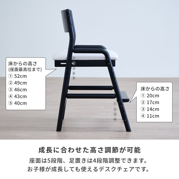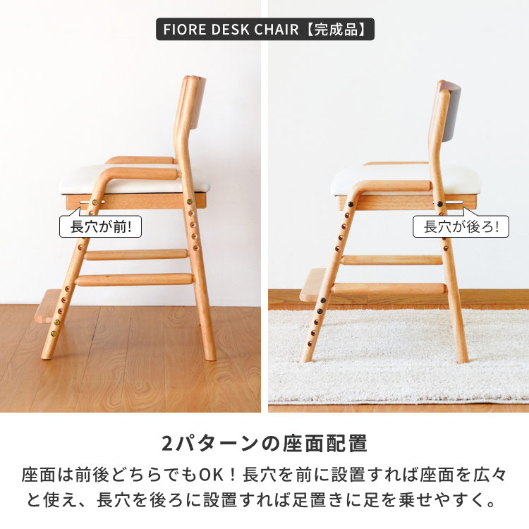 人気の『FIORE(フィオーレ)』シリーズのお求めやすい完全組立品タイプです。組立式ではありますが、丈夫な無垢材を使用したフレームや高さ調節のできる座面と足置きなど、機能面は完成品と変わりません。木製ならではの優しい風合いが特徴で子ども部屋のデスクチェアとしてご使用する以外にもリビング学習用の椅子、食卓に置くダイニングチェアとしてもご使用出来ます。細やかな高さ調整が可能で、お子様の姿勢をサポートしやすい位置に設定が出来ます。