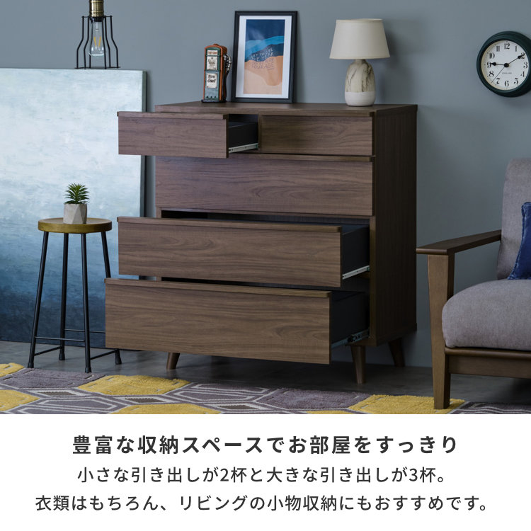 落ち着いた雰囲気の中にも温かさを演出した、飽きの来ない北欧モダンテイストのチェストです。製品には木目調シートを採用。天然木の雰囲気を持ちつつも、安定した色目や柄を再現でき、お手入れも簡単。合計5杯の引き出しには使いやすいようにレールをつけました。1~3段目には開閉スムーズなスライドレールを、容量が大きく重たいものを収納しやすい最下段には奥まで引き出しても重みで引き出しが落下することのないようにフルスライドレールを採用しました。床との接地面が少なく湿気や熱の影響を受けにくい脚付きのデザインは、掃除も簡単に行えるのが嬉しいポイントのひとつ。脚の高さが12.4cmあるので掃除機のヘッドも楽々入れられ、お掃除ロボットも通過できます。ワンルームや寝室などスペースの限られたお部屋から、リビングボードやサイドボードなどのリビング収納にも最適です。