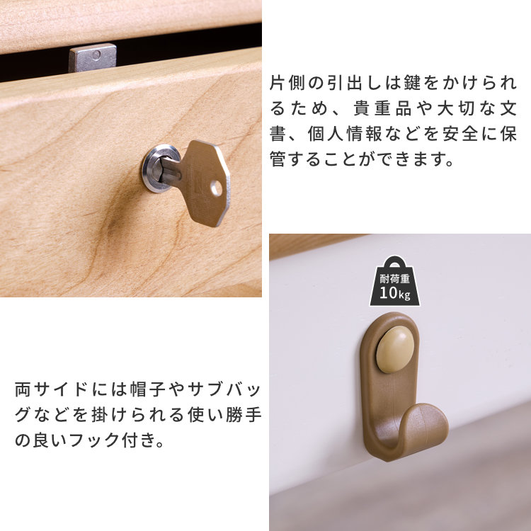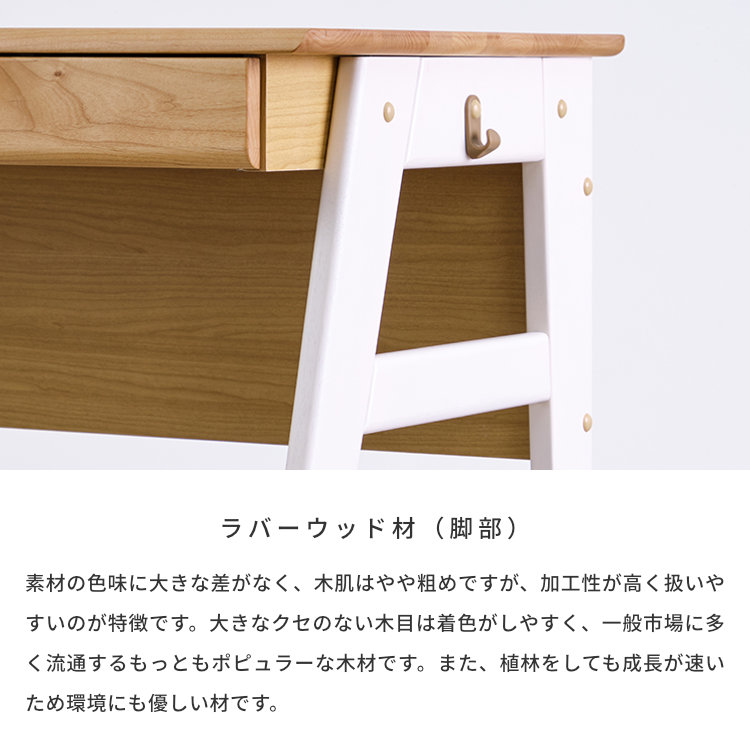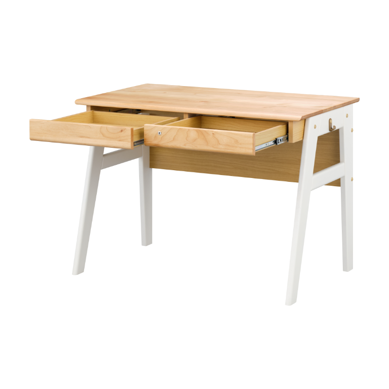 アルダー材を贅沢に使った、学習机「エクリュ」は、ツートーンカラーが目を惹く、個性的で使い勝手の良い木製デスクです。天板や前板には木目が美しいアルダー無垢材を贅沢に使用しました。柔らかな雰囲気がお部屋を引き立てます。仕上げには木材の魅力を最大限に引き立たせるオイル仕上げを採用。お子様にも安心な自然系オイルを採用しました。木の感触を存分にご堪能いただけます。2杯の引き出しはフルスライドレールを採用。奥まで引き出しても落下の心配がありません。引き出し内部は、調湿作用の高い桐材を使用。向かって右側の引き出しは鍵付きとなっていますので、大事な書類などのの保管に便利です。両サイドにはランドセルやバッグを掛けるのに便利なフック付き。脚部はラバー無垢材を使用し、本体をしっかりと支えています。お子様だけではなく、大人でも使えるシンプルなデザインですので、学習机以外にも、PCデスクとして、家事デスクとして、幅広くお使いいただけます。「エクリュ」シリーズの上棚やワゴンを合わせればさらに使いやすくなります。
