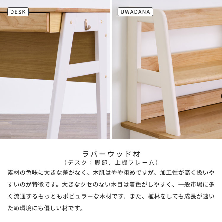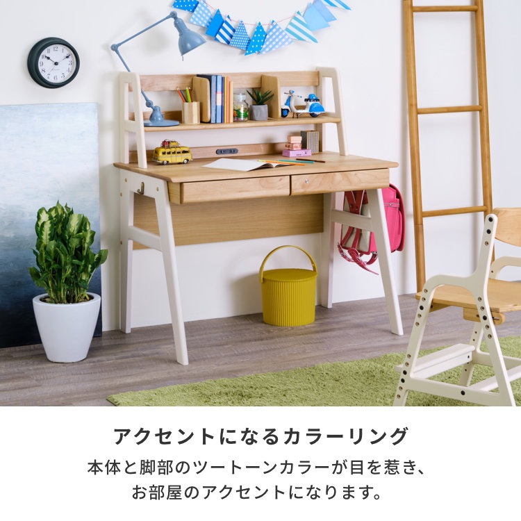2色のカラーリングが目を惹く、おしゃれな学習机・エクリュのデスク2点セットです。幅105cm学習デスクとキャスター付きワゴンのセット。フルスライドレールの引き出しや木製デスクには鍵付きの引き出し(向かって右側のみ)と、コンパクトサイズながら収納力抜群です。文房具を収納するだけでなく、A4サイズやB4サイズも入るので学校のプリントやファイル類、ノートや冊子もしまえます。両サイドにはカバンや帽子、学用品を掛ける時に便利なフックも付いており、機能的にお使い頂けます。木製サイドワゴンの最下段引き出しにはたわみ防止のキャスター付き。内部には仕切板が付いていてとっても便利。学習机としてだけでなく、PCデスクやオフィスデスク、大人の書斎デスクにも最適。シリーズには可動タイプの仕切り板が付いた上棚ブックスタンドも展開中です。テイストが同じ家具でデスク周りを揃えれば、お部屋に統一感が生まれいっそう快適な学習環境に。