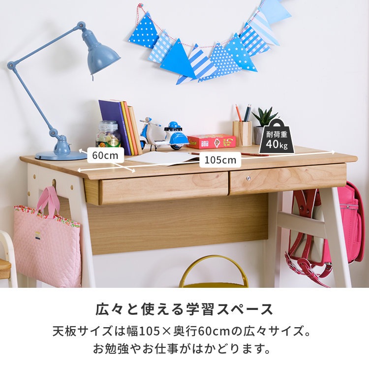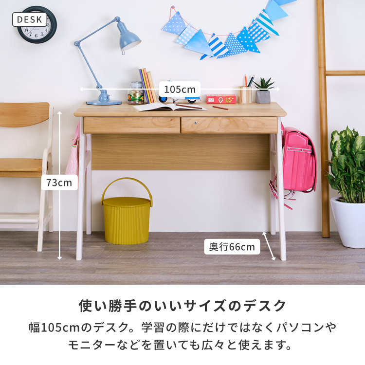 デスク 2点セット つくえ 机 学習 勉強 仕事 宿題 リビング学習 鍵 キャスター ワゴン サイドワゴン デスクワゴン 木製 幅105cm ランドセル 書類 プリント 文房具 収納 入学祝い 進級