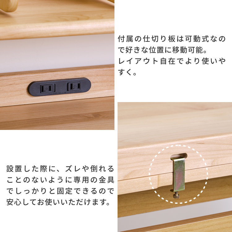 ※2口コンセントはデスクに付いていません。エクリュ上棚99に付いております。
