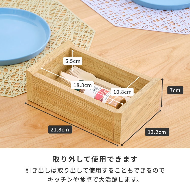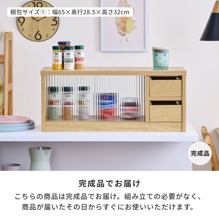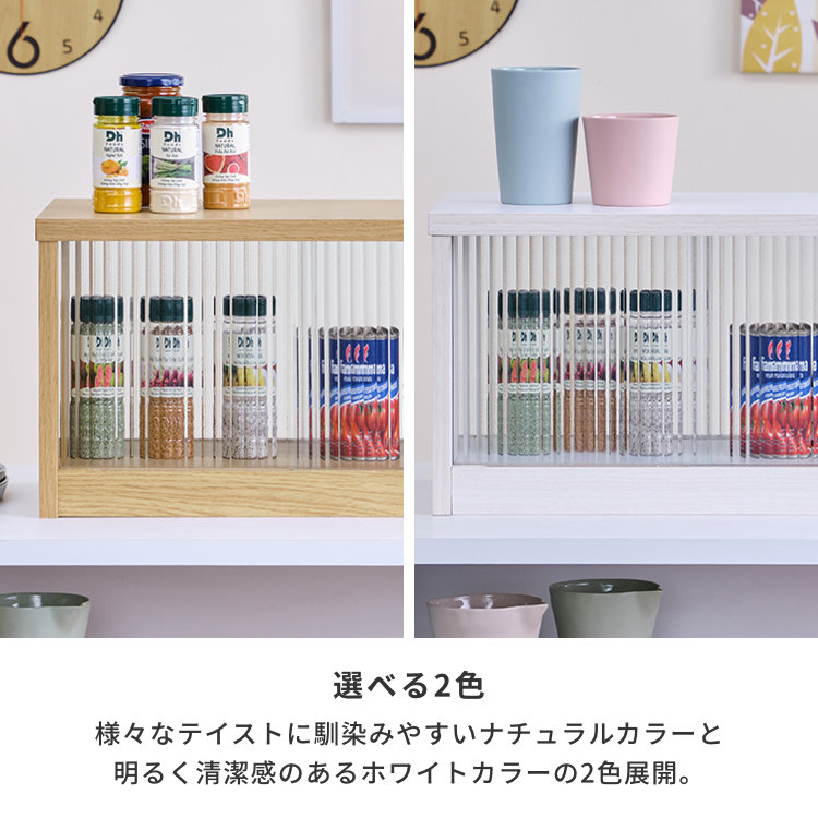 高さ28cm・奥行き23cmと薄型サイズで、スパイスや茶葉などの収納にぴったりなキッチン卓上収納。収納部分は表側からも裏側からも出し入れが可能なのでどこに置いても使いやすく、引き戸にはおしゃれな波状のストライプガラスで程よく透けて、中身がわかりやすくなっています。引き出しは取り出して卓上でも使えます。強度や見た目の美しさにも優れているのも嬉しいポイント。