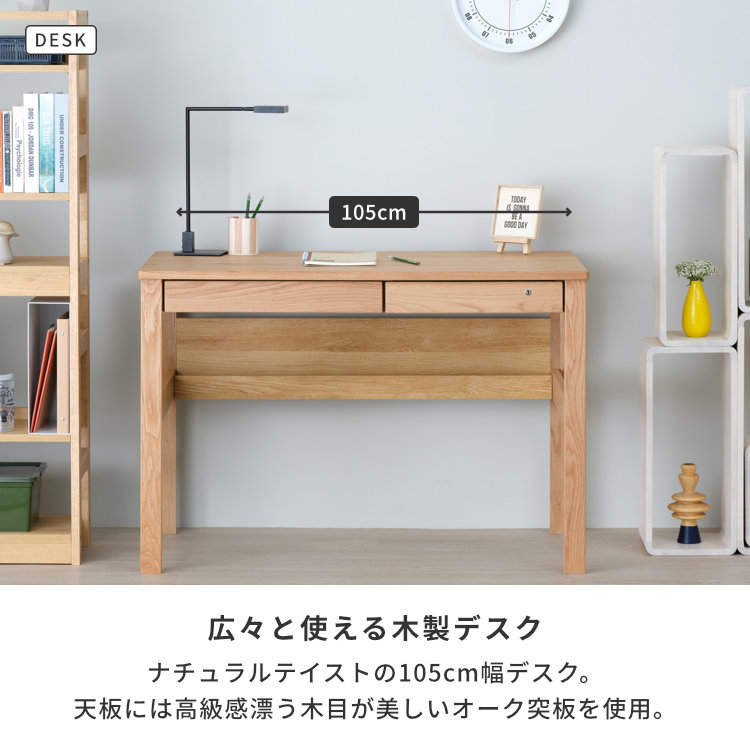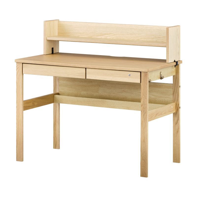 REFLEシリーズの学習デスクと上棚の2点セット。学習デスクは、リビングでも使いやすい幅105cm×奥行58cmのたっぷりとしたサイズです。ノートや文房具の整理整頓に便利な引き出しが左右に2杯あり、A4サイズの物を収納することが可能です。上棚を設置することで、スペースを有効活用することができます。