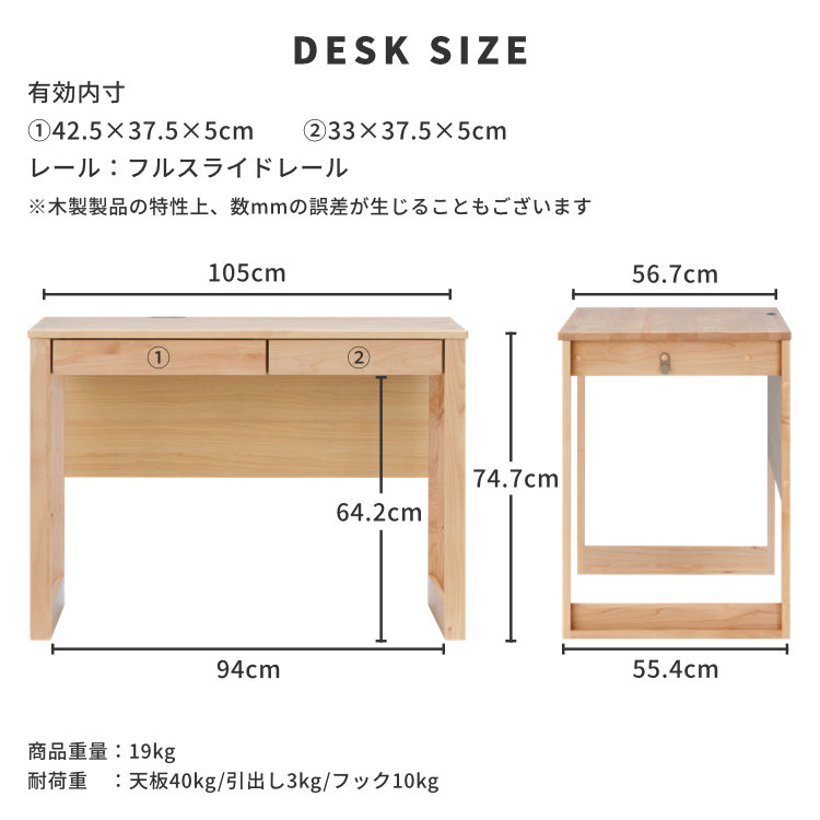 アルダー無垢材を使用した木の温もりを感じることができるL-DESKシリーズの105cm幅デスクと、デスク上の収納力のアップする上棚の2点セットです。デスクの両サイドには、カバンなど掛けておくのに便利なフック付き。また、デスクの向かって左側には、埃が入りにくいスライド式の2口コンセントが付いています。上棚はデスクの機能をさらに向上させ、スマフォやタブレットなどを立てれる溝などがあります。