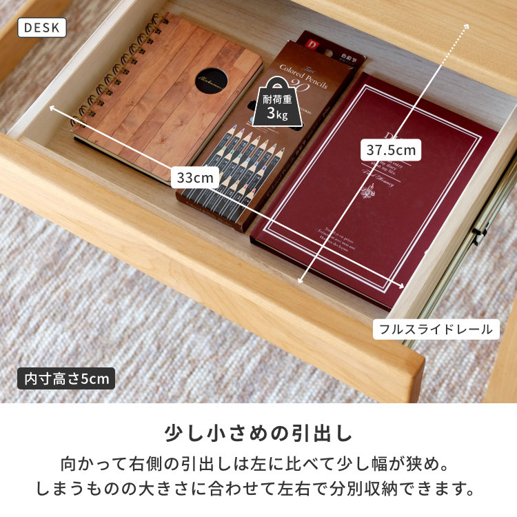 - ※フルスライドレールは勝手に引出しが飛び出てくるのを防ぐため、仕様上最後の数ミリが硬くなっています。そのため、使い始めのうちは開閉が固く感じられたり、締めきるのに力がいることがありますが、使用している間になじんでいき、次第に改善されてまいります。あらかじめご了承ください。