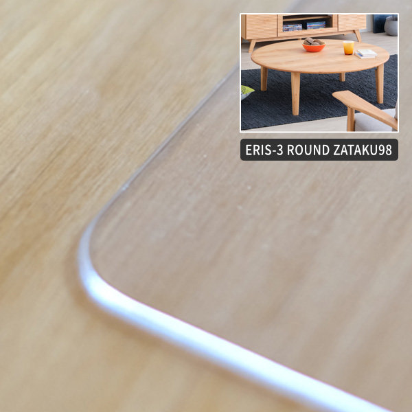 透明度が高く家具本来の見栄えを楽しめます。ベタつきが少ないので食器などのスムーズな移動が可能です。コーティングが施されており、傷つきにくく耐久性に優れています。また、コーティングにより可塑剤が移動しないため、商品天板への影響も心配ありません。化学薬品に対しても強く、綺麗に汚れを落とすことができます。一生紀 ERIS-3 ラウンド座卓 98cm専用にカットした形状となっております。