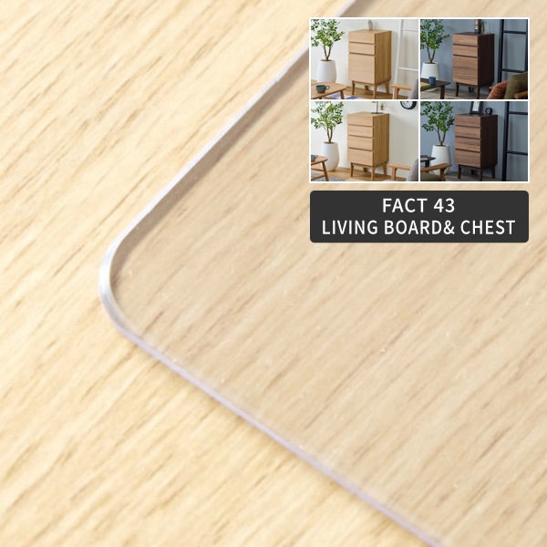 透明度が高く家具本来の見栄えを楽しめます。ベタつきが少ないので食器などのスムーズな移動が可能です。コーティングが施されており、傷つきにくく耐久性に優れています。また、コーティングにより可塑剤が移動しないため、商品天板への影響も心配ありません。化学薬品に対しても強く、綺麗に汚れを落とすことができます。一生紀 FACT 43cm幅リビング収納専用にカットした形状となっております。