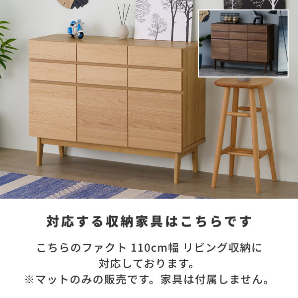 透明度が高く家具本来の見栄えを楽しめます。ベタつきが少ないので食器などのスムーズな移動が可能です。コーティングが施されており、傷つきにくく耐久性に優れています。また、コーティングにより可塑剤が移動しないため、商品天板への影響も心配ありません。化学薬品に対しても強く、綺麗に汚れを落とすことができます。一生紀 FACT 110cm幅リビングボード専用にカットした形状となっております。
