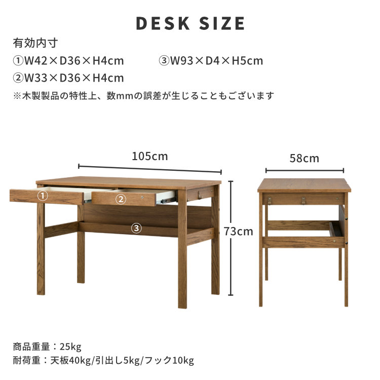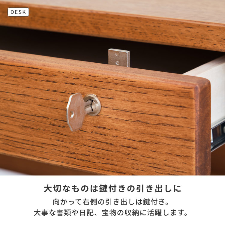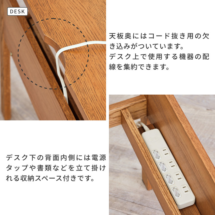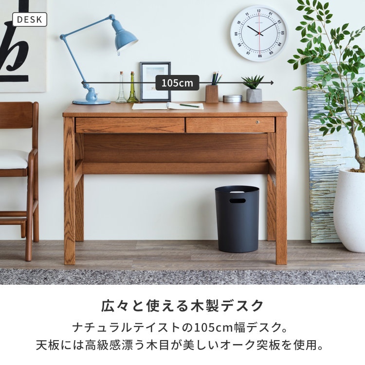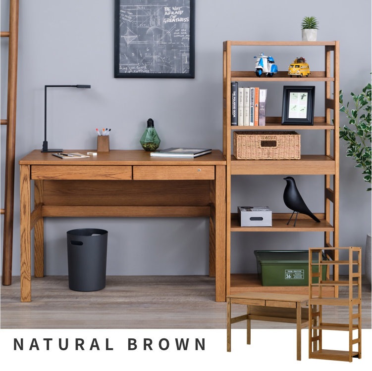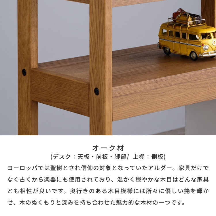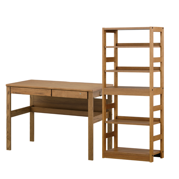 ナチュラルテイスト『REFLE』シリーズの学習家具2点セットです。丈夫で木目の美しいオーク材の突板と無垢材を使用した幅105cmのデスクと、シンプルでスタイリッシュなシェルフの2点セットです。デスク天板の縁部分には丸みをつけ、安全に使用できるよう設計されています。また、PC学習にも対応できるよう、天板にはコードを整理するための欠き込み、背面に電源タップの収容できるスペースを設けています。シェルフは高さ135cmと部屋の中を圧迫しないすっきりした設計で、3か所の棚板は高さを調節することが可能となっております。学習用としても、仕事用としても永くご使用いただけます。