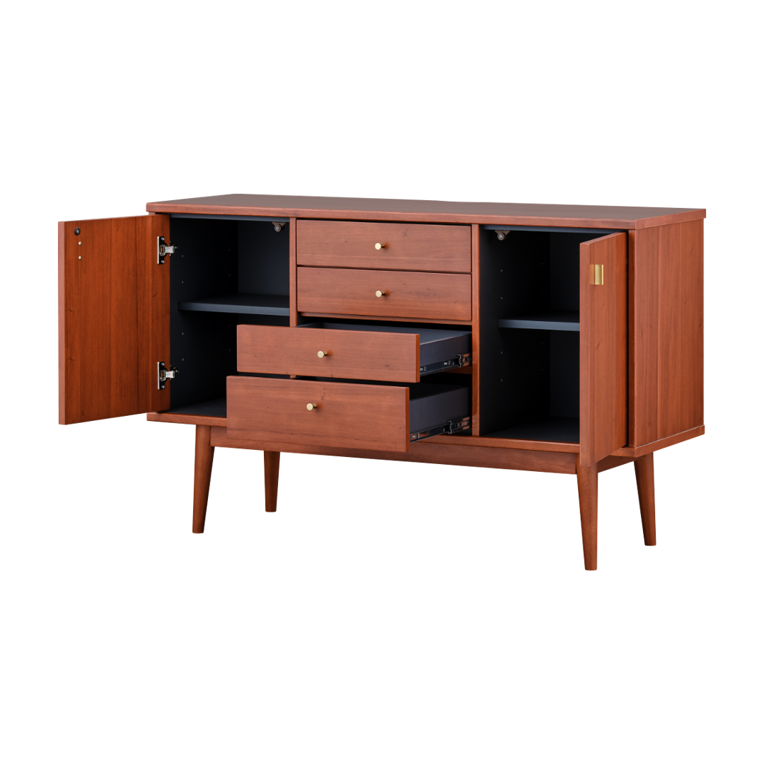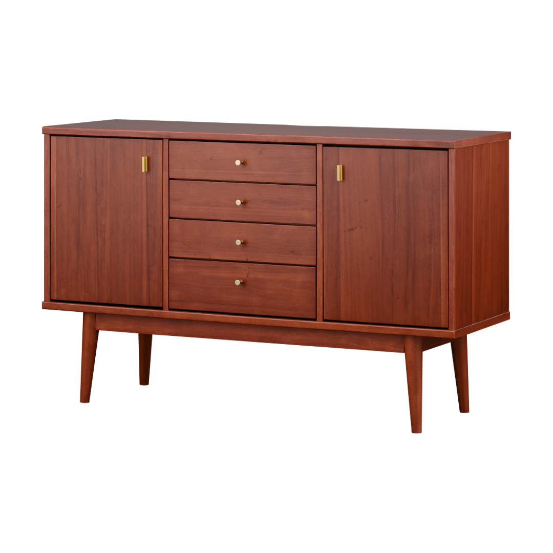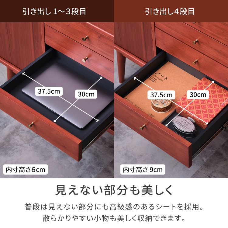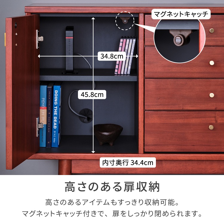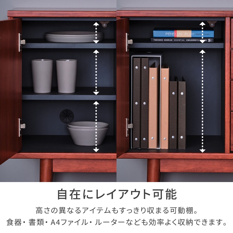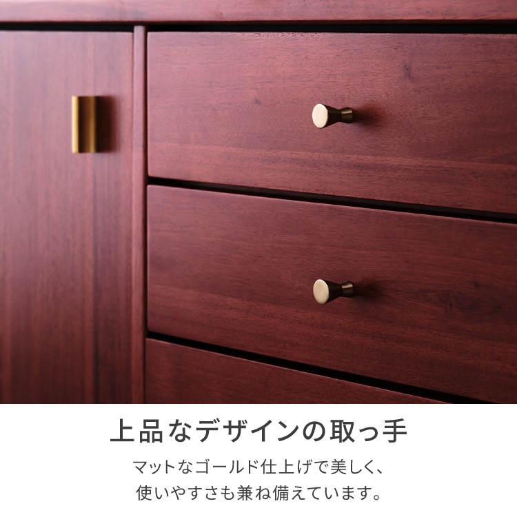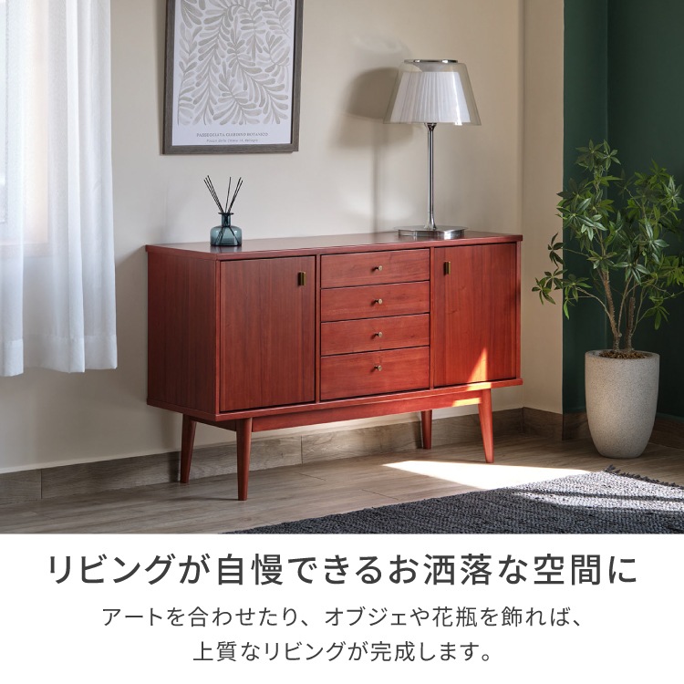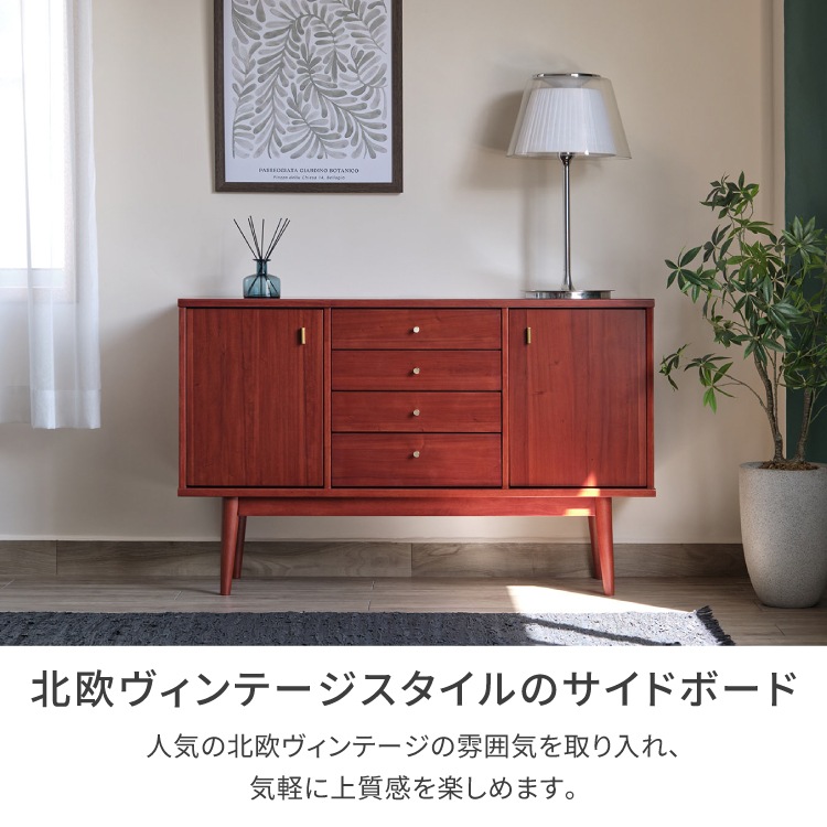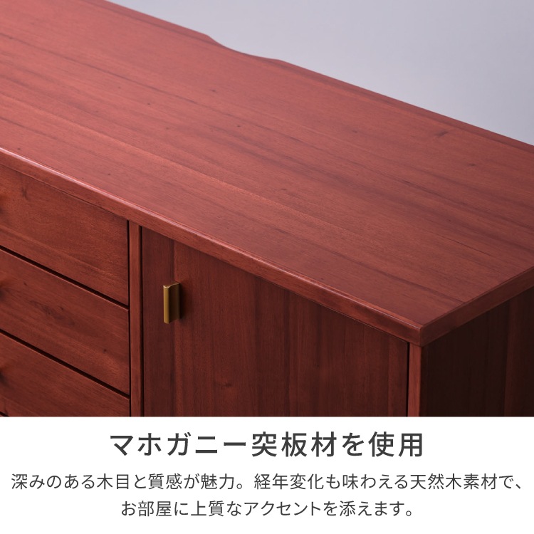 高級アフリカ産マホガニーを使用した、北欧ビンテージ調のサイドボードです。 厳選されたマホガニー突板と繊細なデザインで、インテリアの品格を高めます。重厚感ある木目と質感で、経年変化も楽しめます。たっぷりと設けた収納スペースでお部屋のアイテムをひとまとめに収納可能。上品なデザインでお部屋に上質なアクセントを添えたい方に最適です。