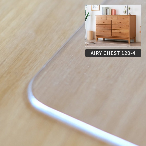 透明度が高く家具本来の見栄えを楽しめます。ベタつきが少ないので食器などのスムーズな移動が可能です。コーティングが施されており、傷つきにくく耐久性に優れています。また、コーティングにより可塑剤が移動しないため、商品天板への影響も心配ありません。化学薬品に対しても強く、綺麗に汚れを落とすことができます。一生紀 AIRY 120cm幅 チェスト専用にカットした形状となっております。