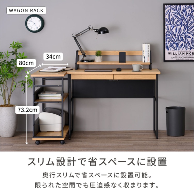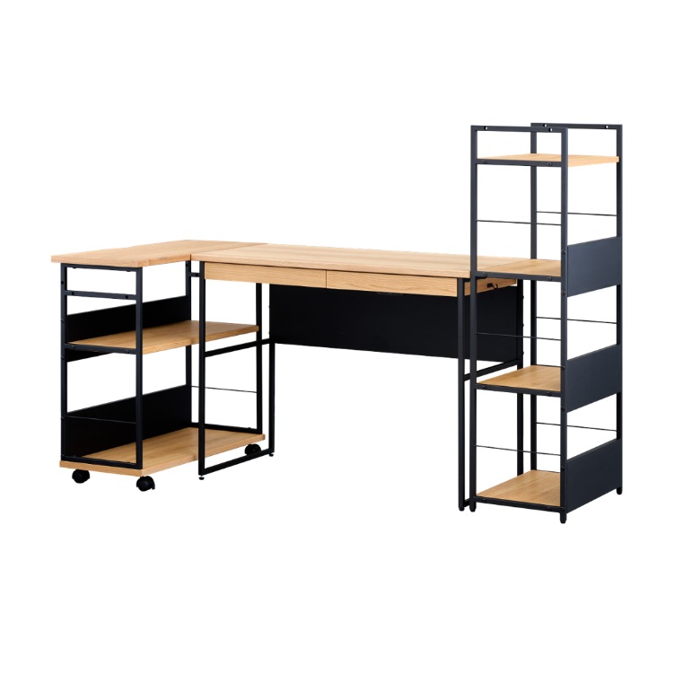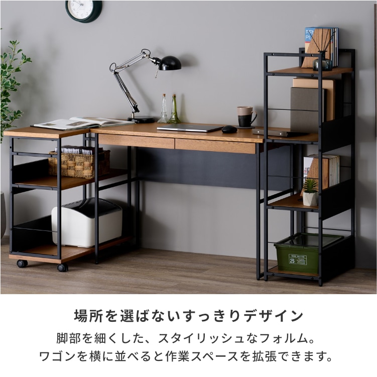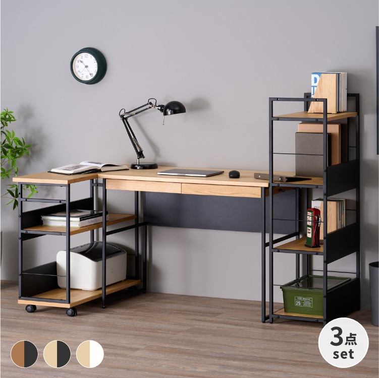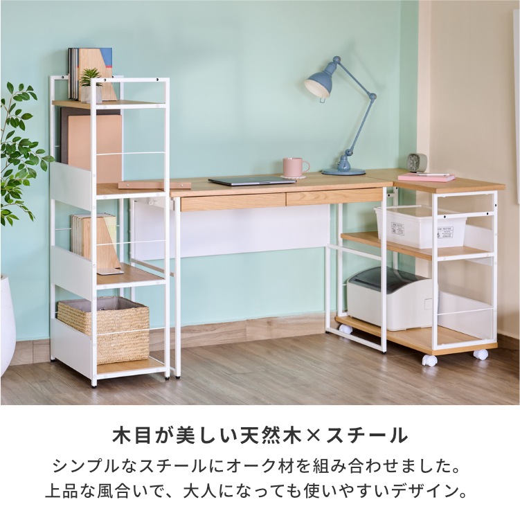 3点セット デスク ワゴンラック サイドラック 学習収納 キャスター付き 家具 シンプル デザイン リビング収納 子供部屋収納 ナチュラル スチール フレームラック 省スペース収納 おしゃれ オーク材 木製