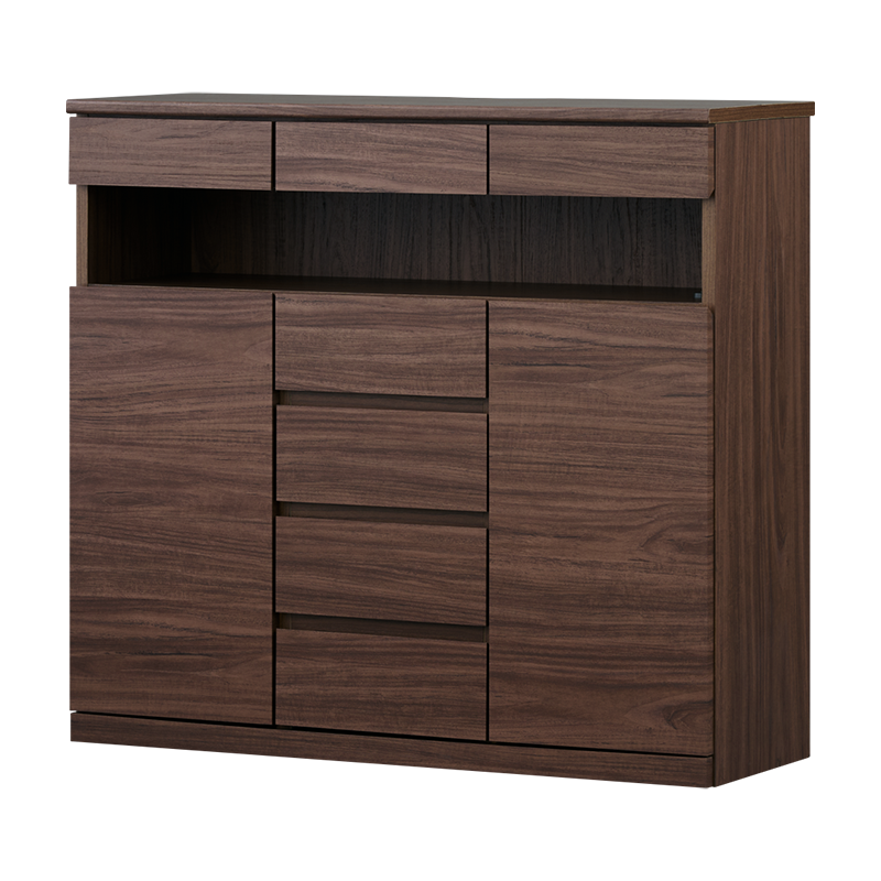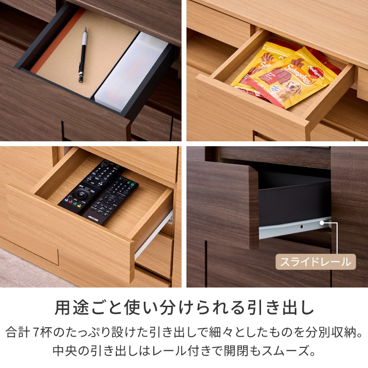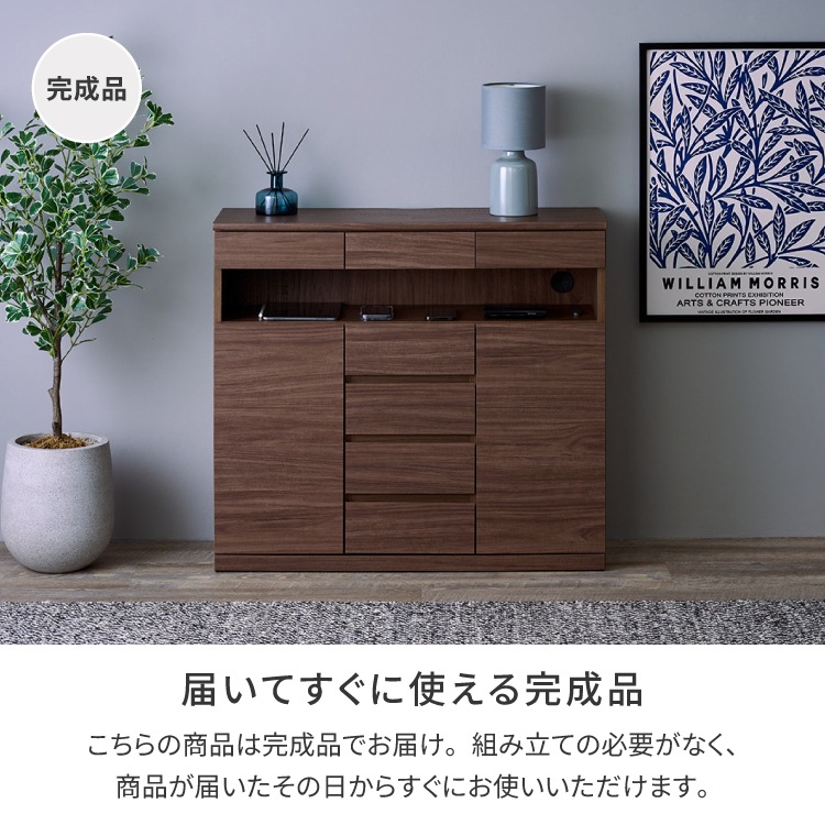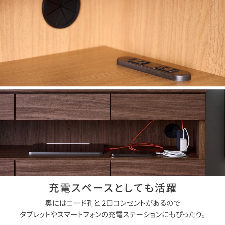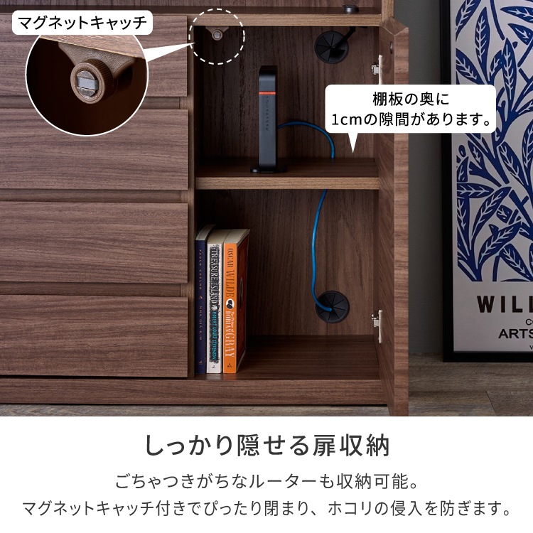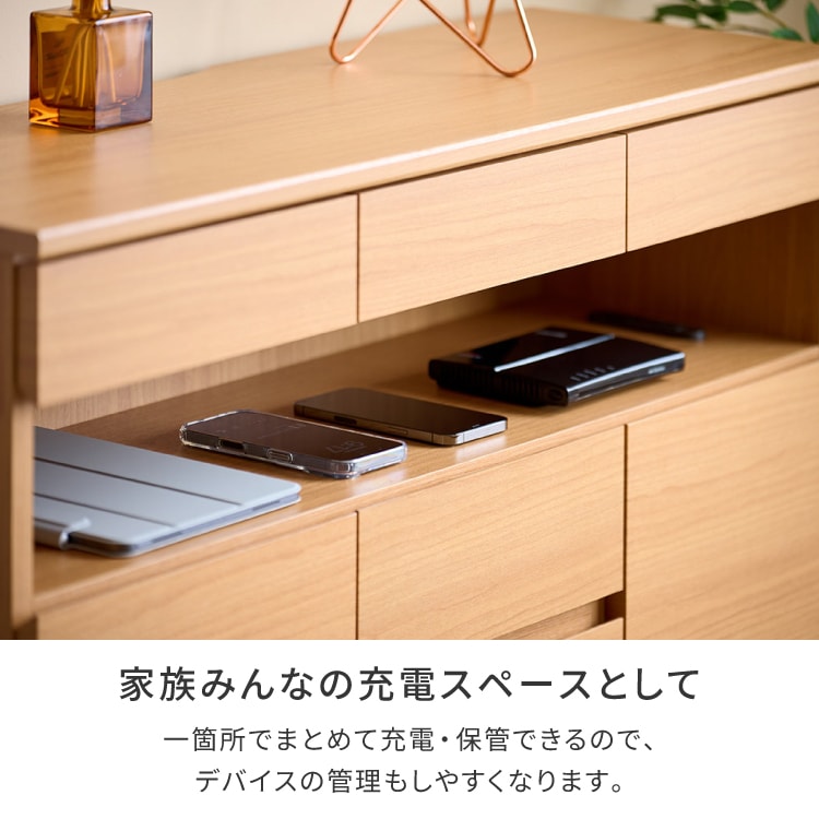 シンプルなデザインでお部屋のテイストを選ばないリビングキャビネット。7杯の引出しと扉収納で小物もすっきり整理可能です。圧迫感を軽減する奥行スリムタイプの収納は省スペースでも高い収納力を発揮します。日常のちょっとした雑貨から書類、日用品までまとめて整理でき、すっきりとした生活空間を叶えます。配線をスマートに誘導できるように様々な工夫を凝らしたので、ルーターの収納や、家族全員のスマホやタブレットの充電スポットとしても重宝します。