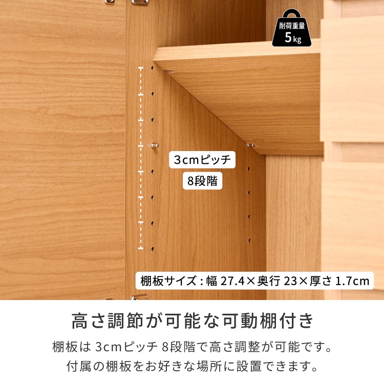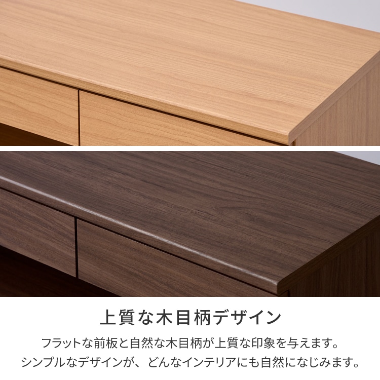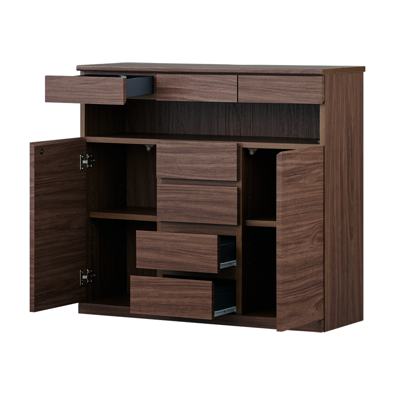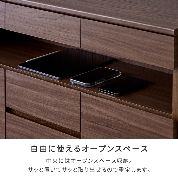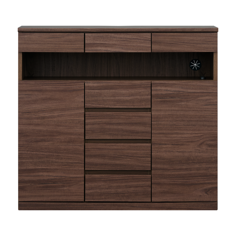 シンプルなデザインでお部屋のテイストを選ばないリビングキャビネット。7杯の引出しと扉収納で小物もすっきり整理可能です。圧迫感を軽減する奥行スリムタイプの収納は省スペースでも高い収納力を発揮します。日常のちょっとした雑貨から書類、日用品までまとめて整理でき、すっきりとした生活空間を叶えます。配線をスマートに誘導できるように様々な工夫を凝らしたので、ルーターの収納や、家族全員のスマホやタブレットの充電スポットとしても重宝します。