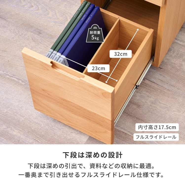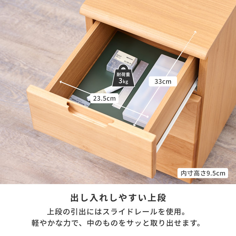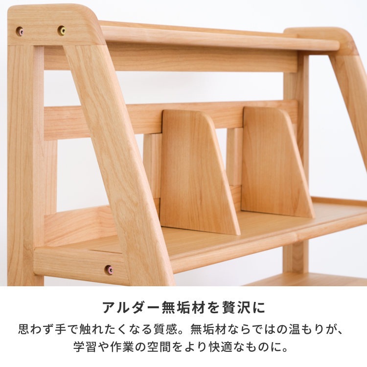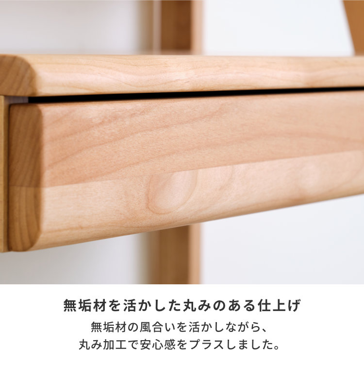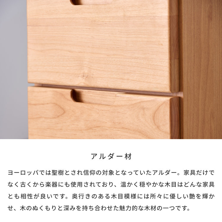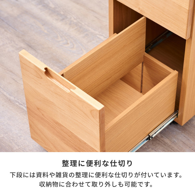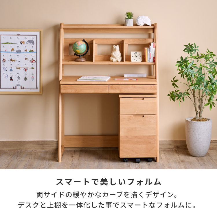 アルダー無垢材を贅沢に使用した伸びやかな脚が特徴的なデスクとワゴンのセット。両サイドの緩やかなカーブが美しいデザインで、思わず手で触れたくなる質感。無垢材ならではの温もりが学習や作業をする空間をより快適なものに。