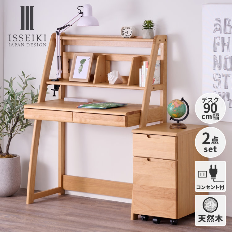 学習机 2点セット 幅90 机 上棚 ワゴン スリム コンパクト 勉強机 学習デスク リビング学習 木製 キャスター付き シンプル デスク デスクセット 子供 北欧 かわいい おしゃれ 棚 アルダー材 アルダー ベージュ