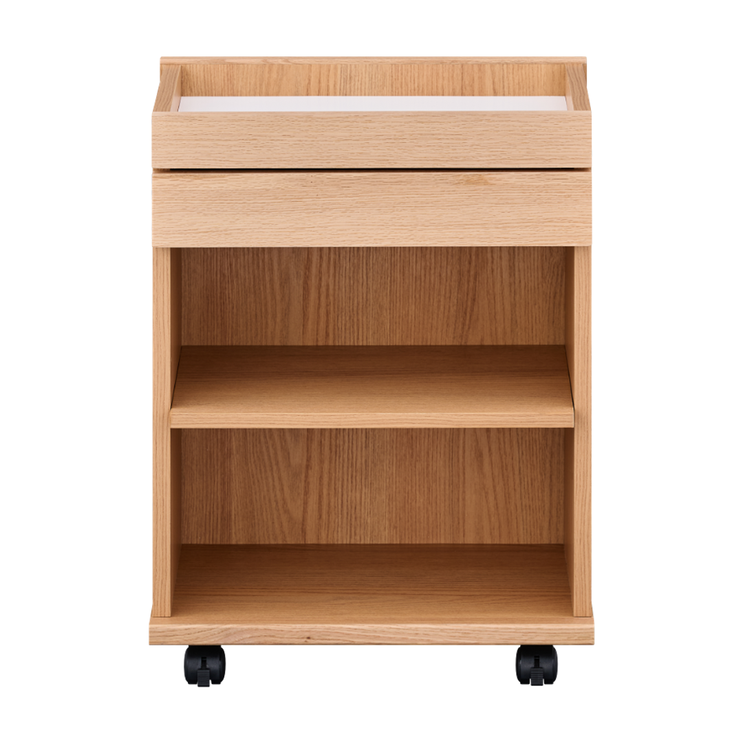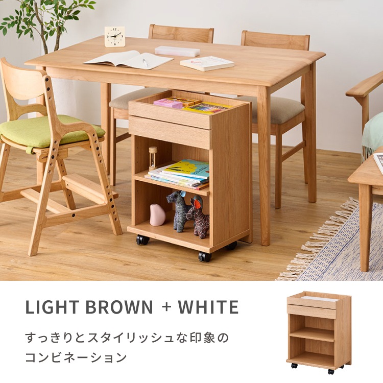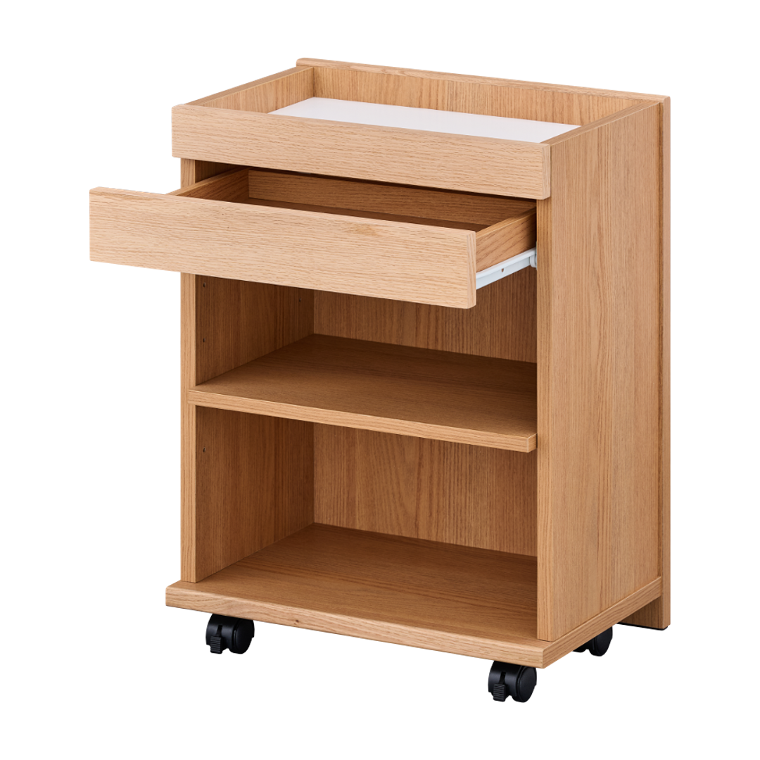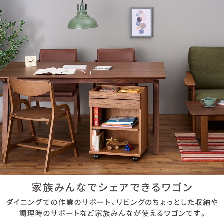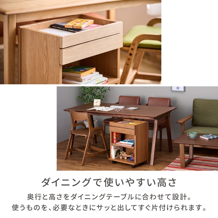 木目が美しいレッドオーク材を使用したキャスター付きワゴン。ダイニングテーブルの下に収まるサイズなので、リビング学習やリモートワークの道具をひとまとめにして使いたい時にサッとだしてサッとしまえます。家族みんなで使えるシンプルなデザインでお部屋をすっきりと使いやすく整えます。