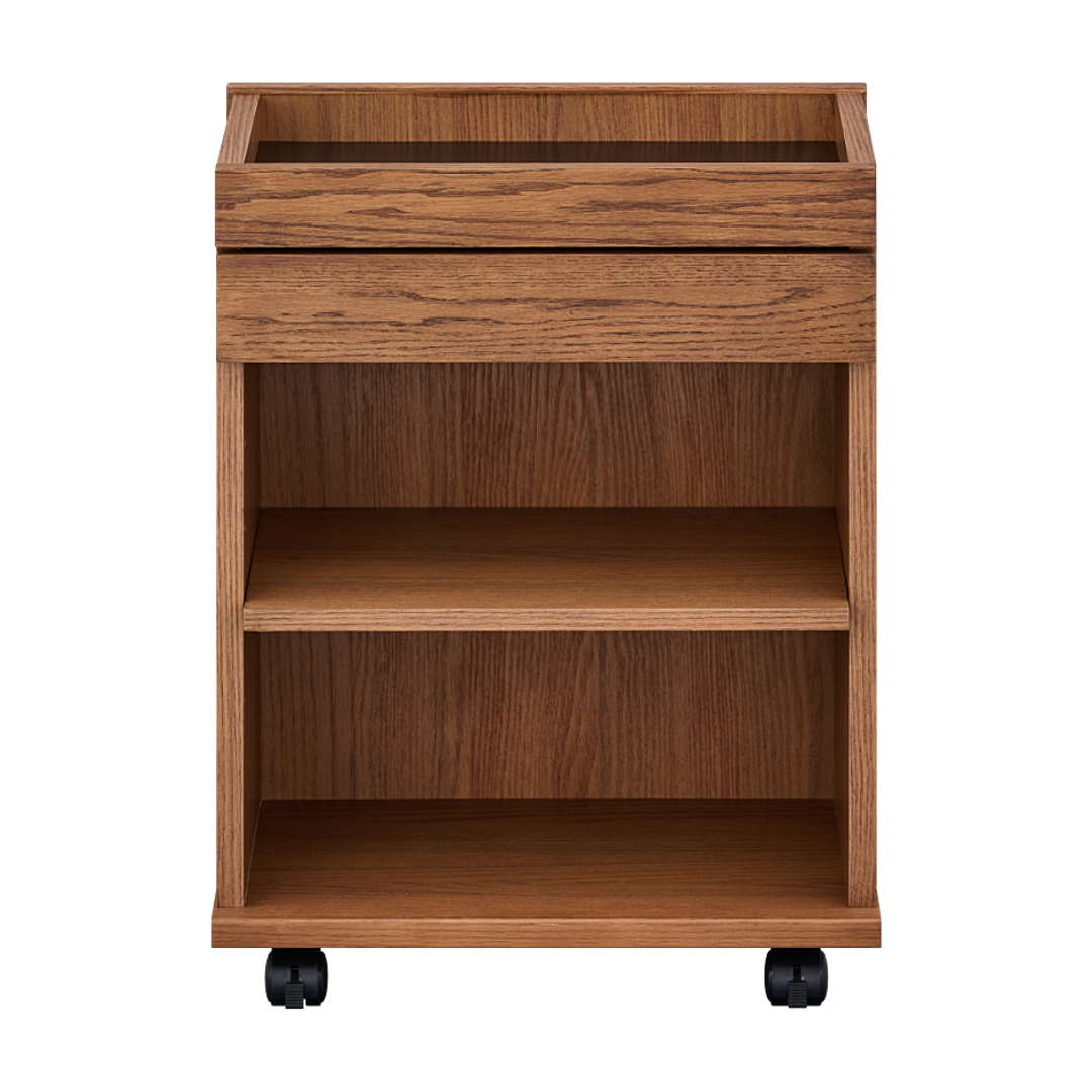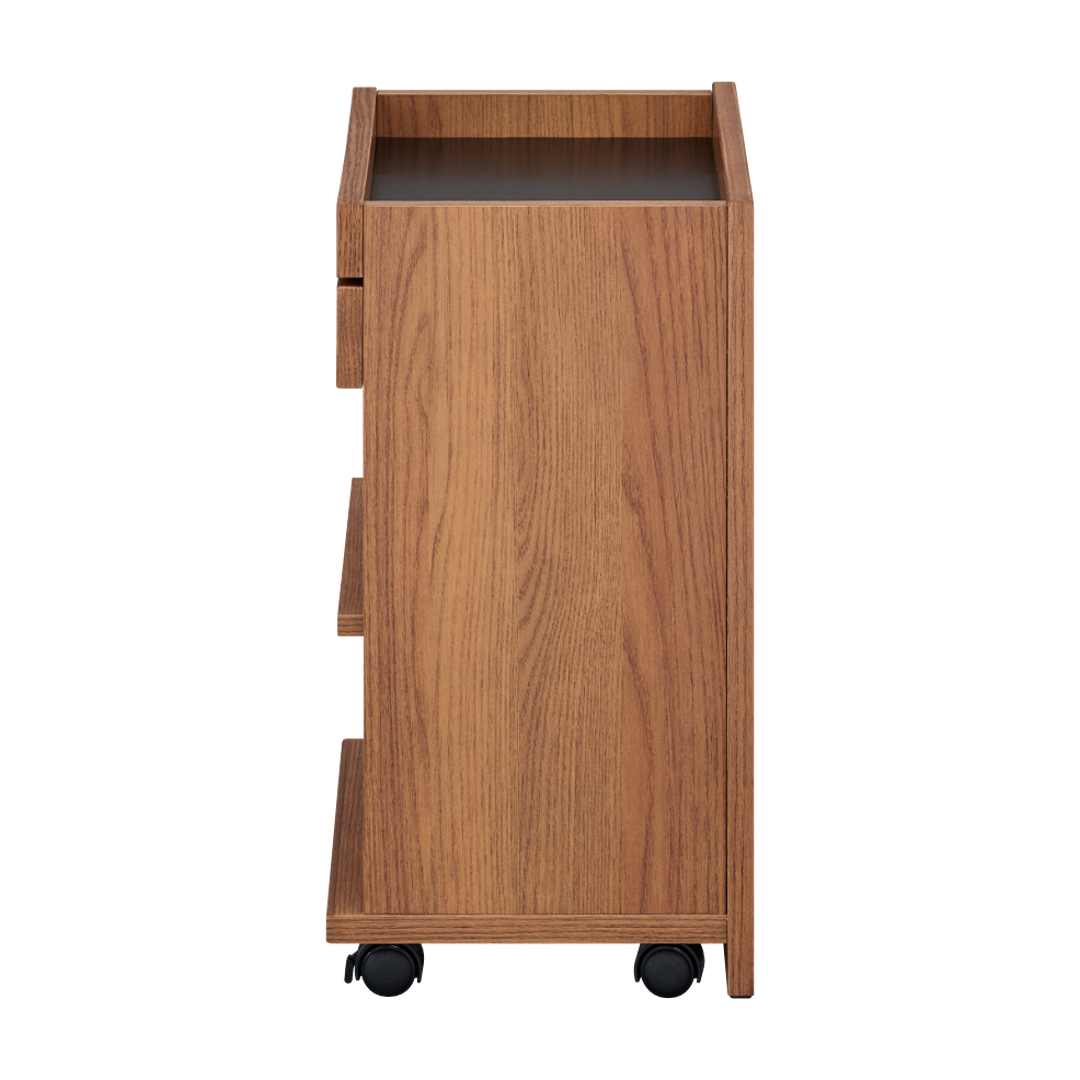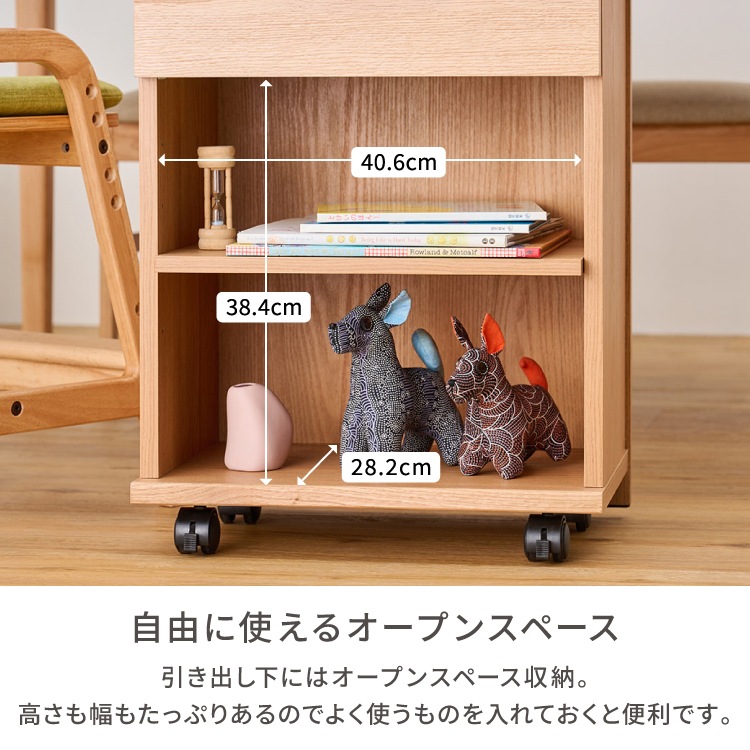 木目が美しいレッドオーク材を使用したキャスター付きワゴン。ダイニングテーブルの下に収まるサイズなので、リビング学習やリモートワークの道具をひとまとめにして使いたい時にサッとだしてサッとしまえます。家族みんなで使えるシンプルなデザインでお部屋をすっきりと使いやすく整えます。